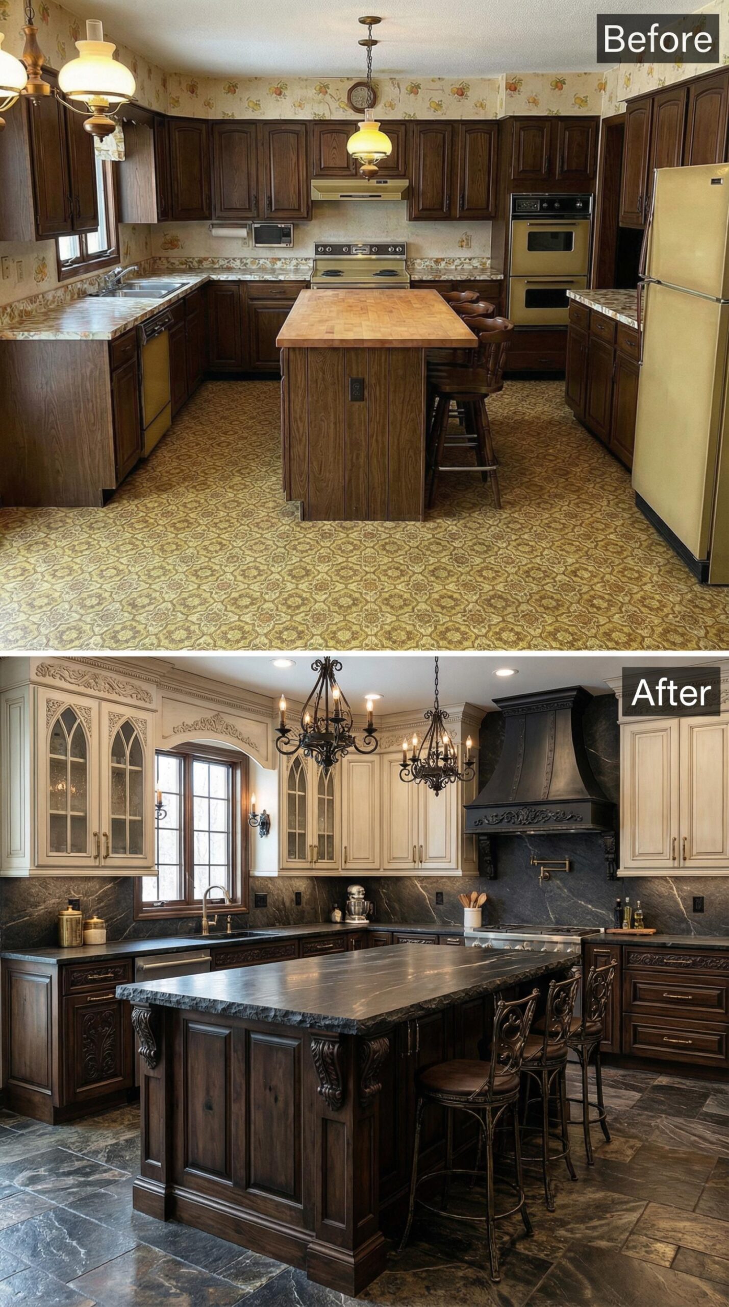 Rich espresso cabinetry paired with creamy glazed upper cabinets creates stunning visual contrast in this sophisticated transformation. Dark marble countertops and an ornate range hood anchor the space, while wrought iron chandeliers add dramatic flair. Decorative corbels and glass-front display cabinets elevate the kitchen from basic to breathtaking, proving strategic upgrades deliver maximum impact.