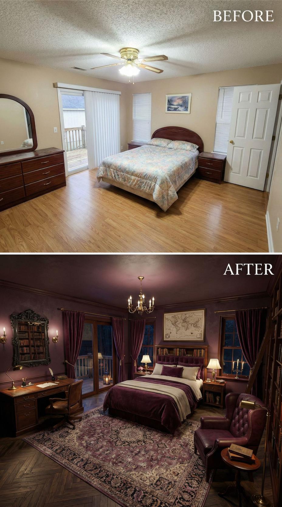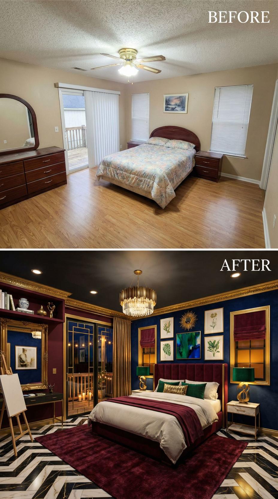 Bold navy walls replace beige neutrals while gold crown molding adds architectural drama to this stunning transformation. The builder grade bedroomโs basic ceiling fan gives way to a glamorous crystal chandelier, while rich burgundy velvet upholstery and emerald accents create luxurious depth. Botanical gallery walls and geometric patterns elevate the space from bland to breathtakingly sophisticated.