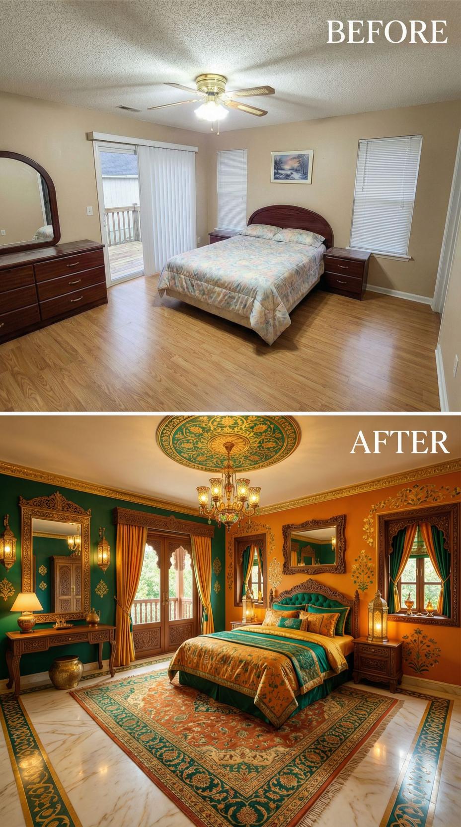 Rich emerald walls adorned with golden motifs completely transformed this builder grade bedroom into an exotic sanctuary. Luxurious amber and teal bedding coordinates with ornate brass lighting and decorative ceiling medallions. Intricately patterned rugs layer over polished marble floors, while heavy silk curtains frame arched doorways. Traditional carved furniture and metallic accents create an authentic palace atmosphere.