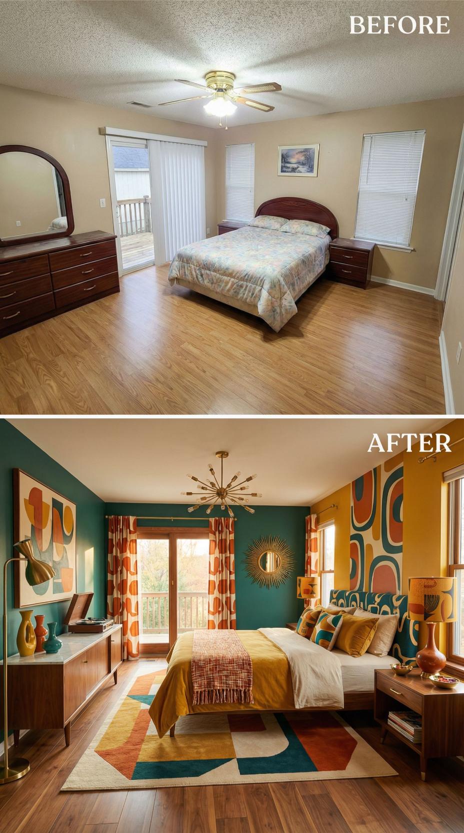 Bold teal walls and vibrant geometric wallpaper transformed this bland builder grade bedroom into a stunning 1970s-inspired retreat. Warm mustard bedding, rich walnut furniture, and playful orange curtains create perfect color harmony. The geometric area rug anchors the space while brass accents and retro artwork complete this groovy maximalist makeover that celebrates fearless pattern mixing.