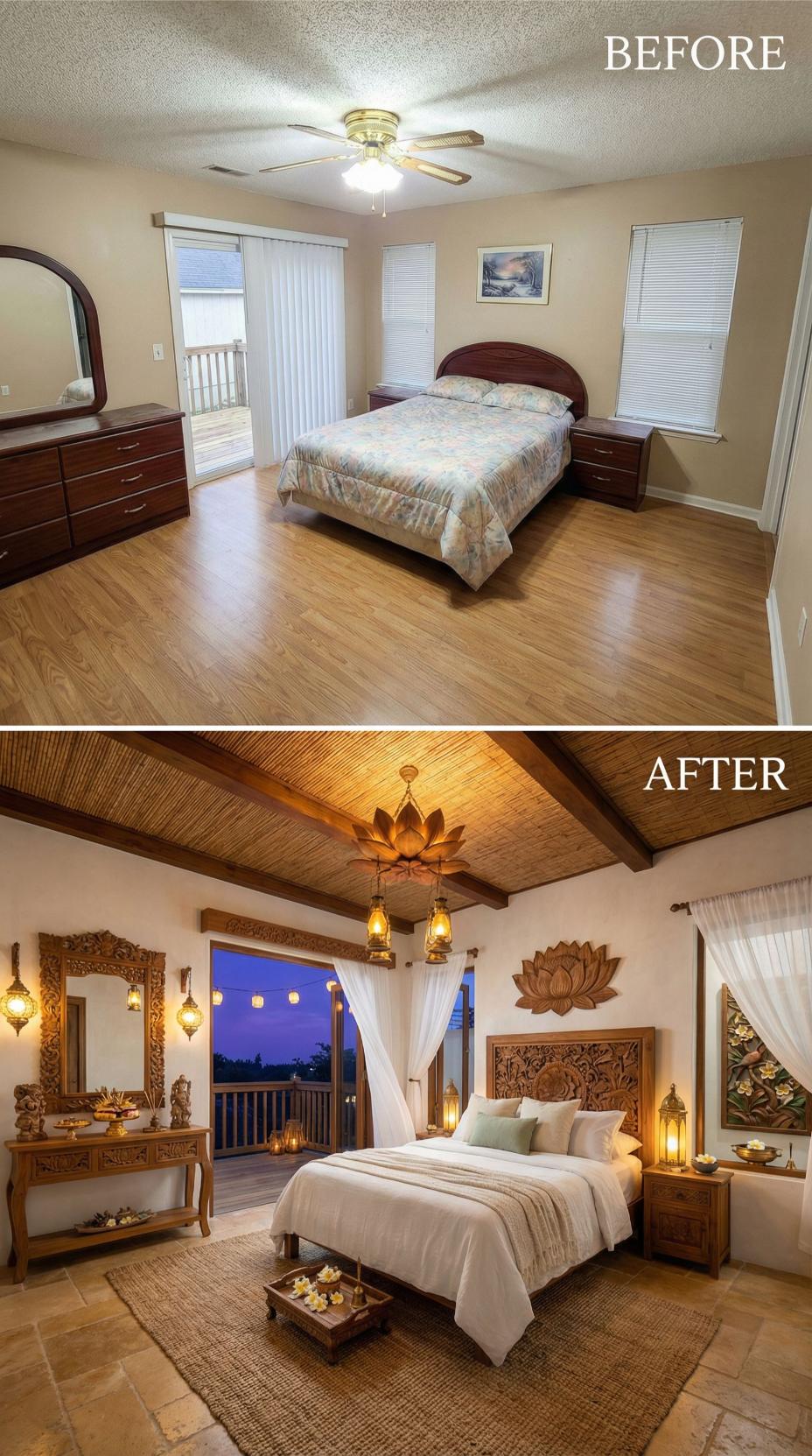 Warm wood ceiling beams and intricately carved teak furnishings completely transformed this ordinary builder grade bedroom into an exotic retreat. Moroccan lanterns cast ambient light while lotus-shaped ceiling medallions and hand-carved wall art create stunning focal points. Natural jute rugs, flowing white curtains, and brass accents replace generic finishes with luxurious textures that evoke a high-end spa experience.