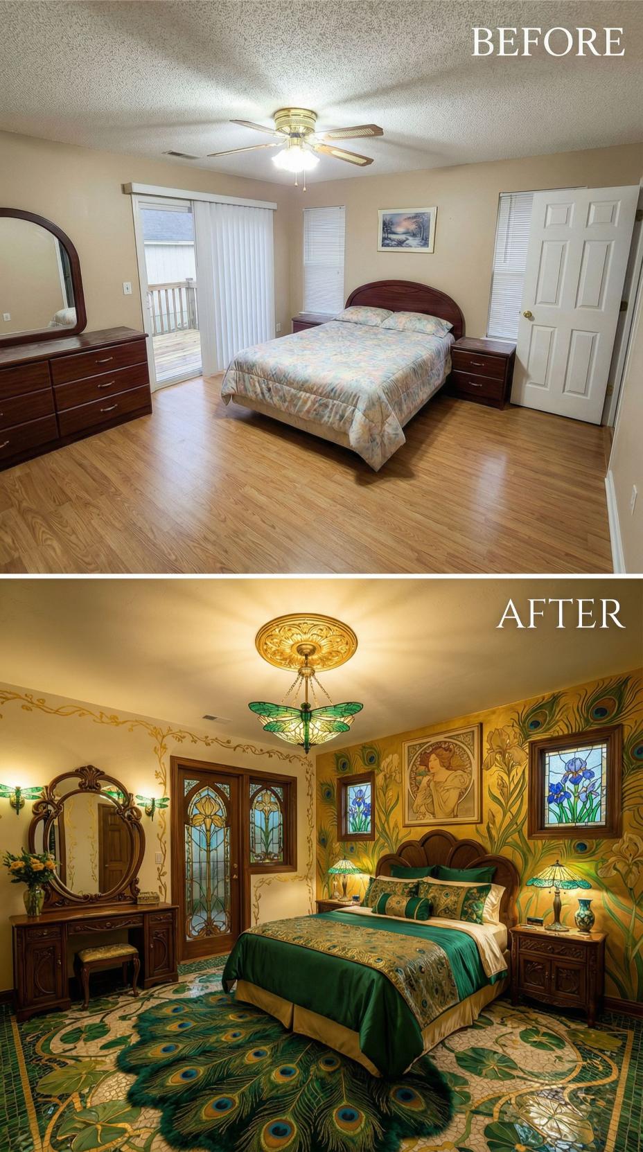 Bold peacock feather motifs and Art Nouveau-inspired murals completely transformed this once-bland builder grade bedroom into a luxurious jewel-toned retreat. Hand-painted botanical designs flow across golden walls, while stained glass panels and emerald green textiles create rich layers of color and pattern. The ornate ceiling medallion and dragonfly pendant light fixture enhance the period aesthetic, proving how artistic vision can elevate any ordinary space into something truly extraordinary.