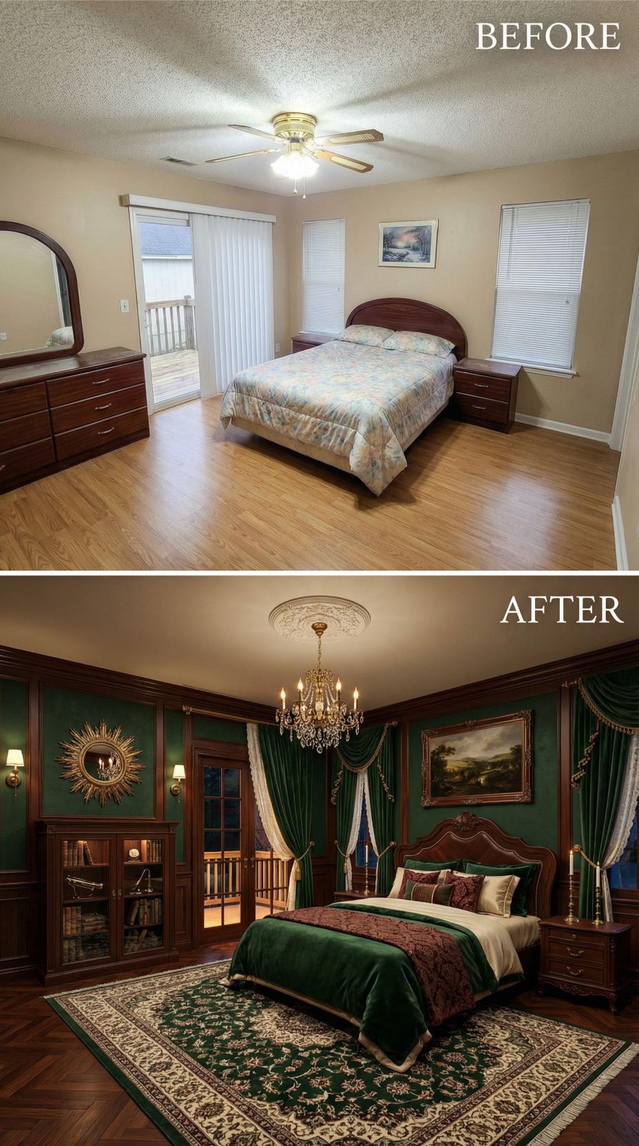 Opulent emerald walls and rich mahogany wainscoting transform this builder grade bedroom into a luxurious retreat. Crystal chandeliers replace basic ceiling fans while elaborate drapery frames windows that once held simple blinds. Built-in bookcases, ornate mirrors, and Persian-style rugs elevate the space from standard to spectacular, creating an elegant sanctuary.