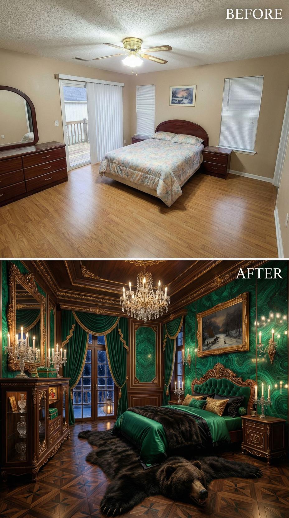 Dramatic emerald silk wallpaper and ornate gold molding transform this builder grade bedroom into a luxurious palace-worthy retreat. Rich green velvet bedding contrasts beautifully against gilded furniture, while crystal chandeliers replace basic ceiling fans. Elaborate window treatments and parquet flooring elevate the space from standard contractor finishes to sophisticated European grandeur.