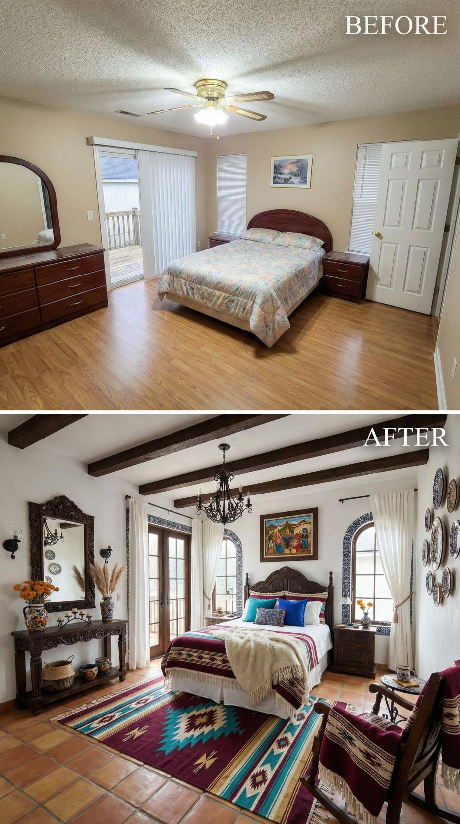 Rich terra cotta tiles replace basic hardwood flooring while dramatic exposed wooden ceiling beams transform the plain builder grade bedroom into an authentic hacienda retreat. Ornate wrought iron chandeliers and colorful Southwestern textiles create vibrant contrast against crisp white walls. Hand-painted Talavera pottery and arched architectural details complete this stunning Spanish colonial transformation.