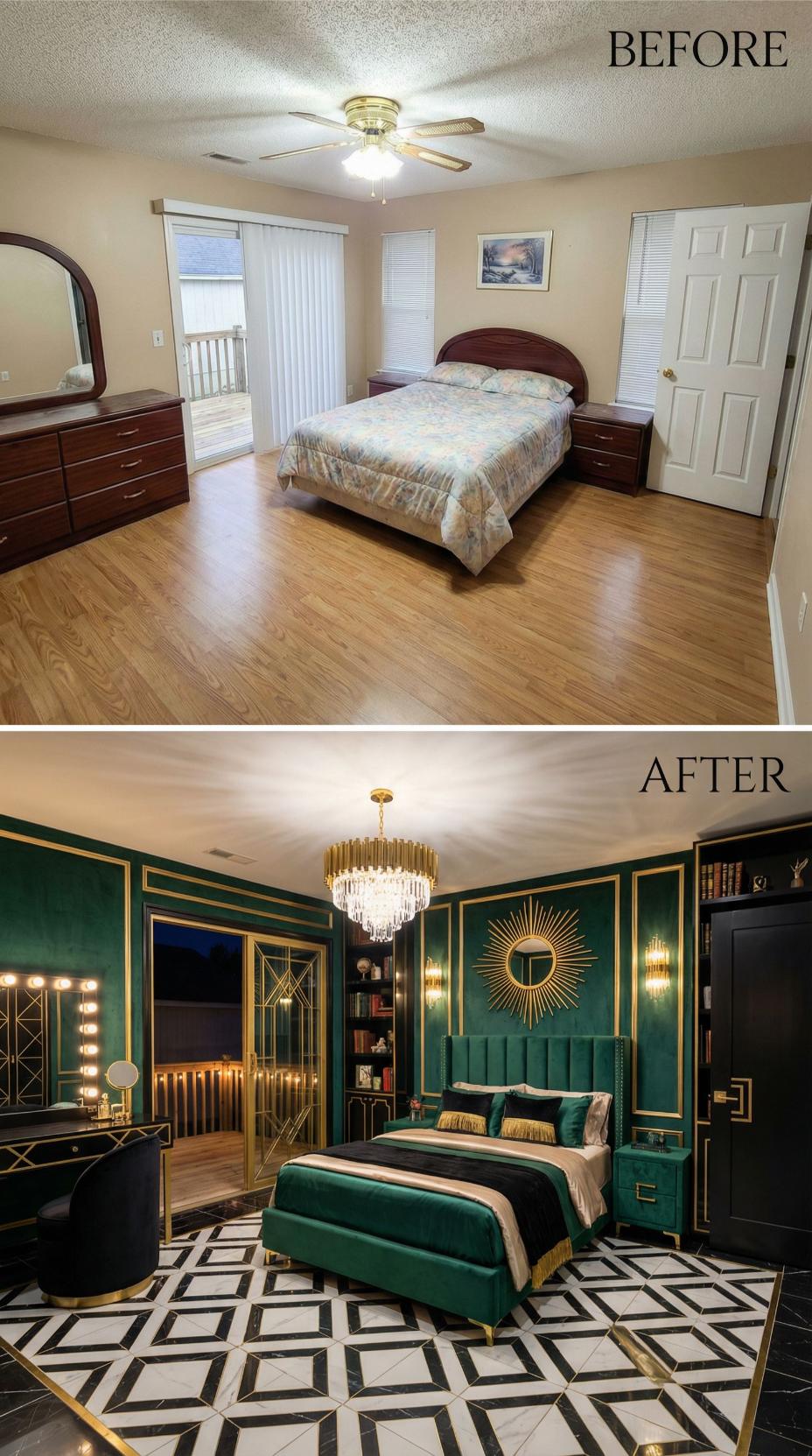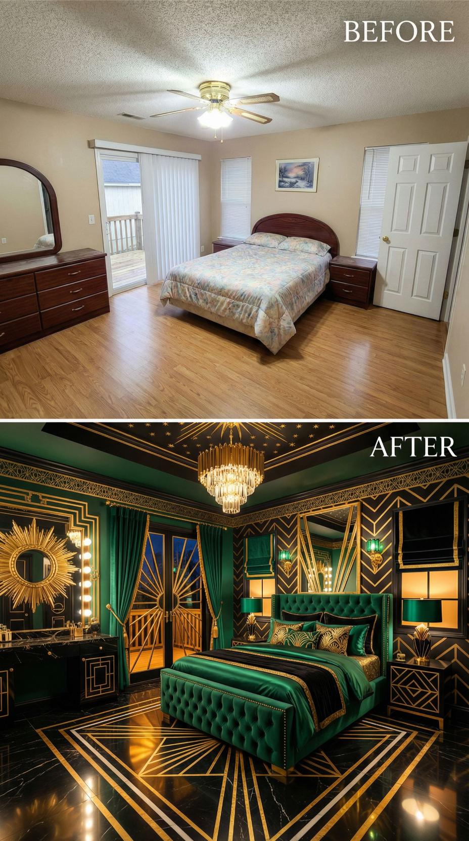 Bold emerald green velvet and geometric gold patterns completely reimagine this builder grade bedroom into a luxurious art deco retreat. Rich forest green walls adorned with intricate metallic accents replace bland beige surfaces, while dramatic crystal chandeliers and plush tufted headboards elevate the space from ordinary to extraordinary. Golden geometric floor patterns and matching decorative elements create stunning visual cohesion throughout.