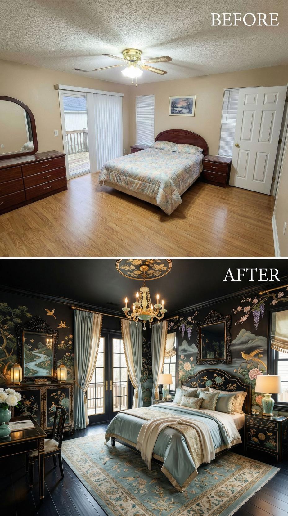 From Builder Grade Bedroom to Chinoiserie-Inspired Dark Romance