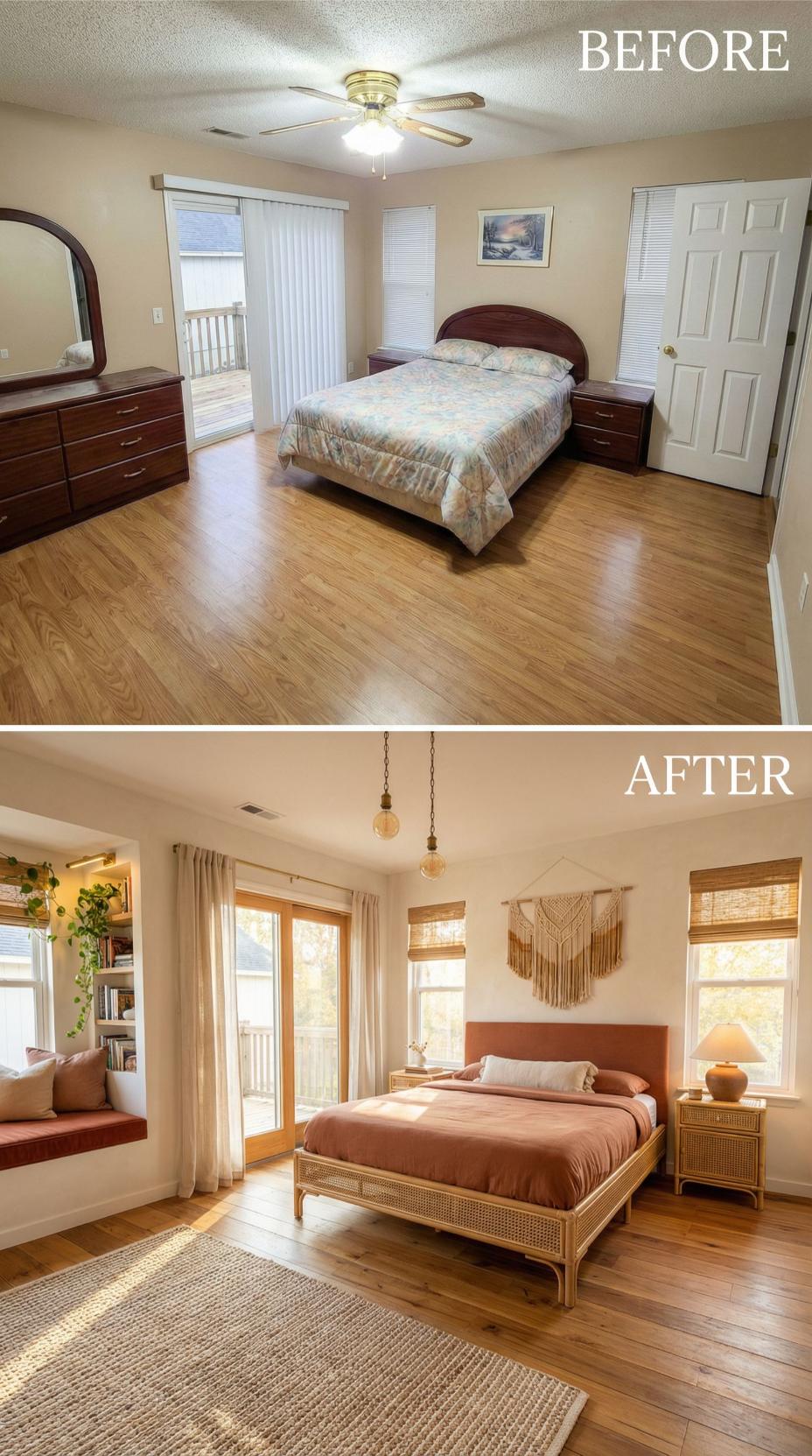 Dark traditional furniture gets replaced with natural rattan pieces that instantly lighten the space. Bamboo window shades and flowing curtains soften harsh vertical blinds, while a macrame wall hanging adds artisanal texture above the leather headboard. Built-in shelving showcases plants and warm lighting, transforming sterile walls into a cozy reading nook with rich terracotta pillows.