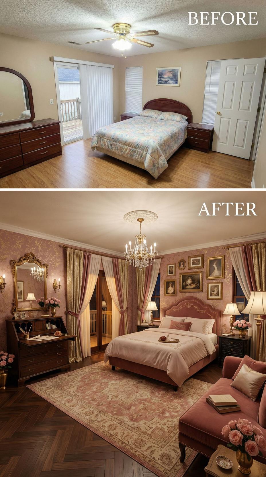 Bold floral wallpaper and luxurious rose-toned drapery transform this once-basic builder grade bedroom into an elegant French-inspired retreat. Ornate carved wood furniture replaces simple pieces, while a crystal chandelier and decorative ceiling medallion add sophisticated architectural interest. Rich burgundy and gold accents create warmth against cream walls, elevating the space from ordinary to extraordinary with traditional European charm.
