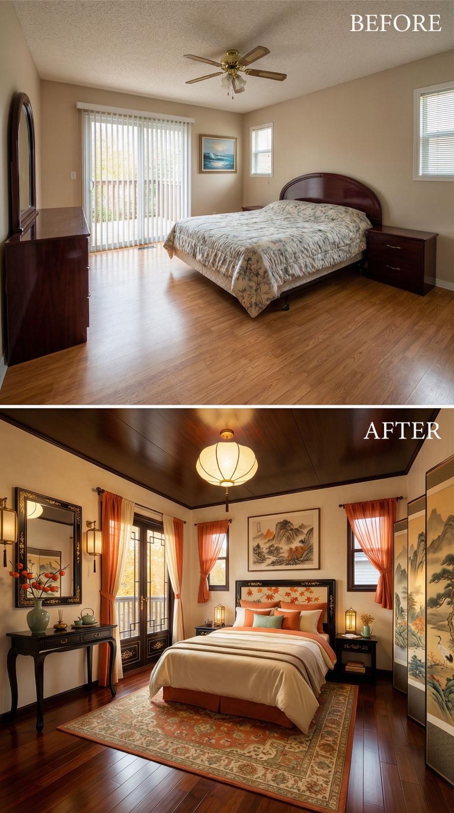 From Builder Grade Bedroom to Dramatic Asian-Inspired Sanctuary