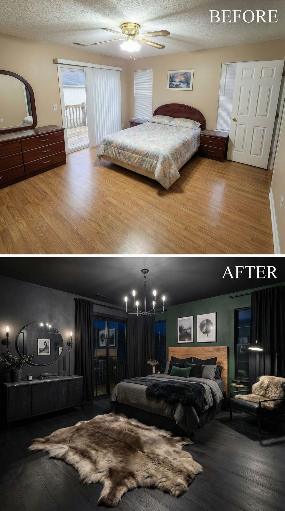 Dark emerald walls replace beige builder grade finishes in this stunning bedroom transformation. The original ceiling fan and basic furniture give way to a sophisticated black chandelier, sleek walnut platform bed, and luxurious fur accents. Rich forest green paint creates an intimate cocoon effect, while black window treatments and modern artwork elevate the space from generic to glamorous.