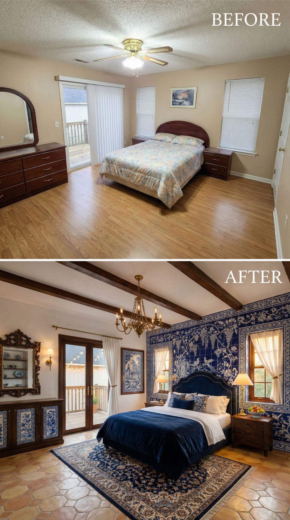 Rich blue and white Talavera-inspired tiles transform this builder grade bedroom into a Spanish colonial masterpiece. Exposed dark wood ceiling beams add architectural drama while ornate blue wallpaper creates stunning visual impact behind the carved headboard. Terracotta hexagon flooring replaces generic laminate, while an antique brass chandelier and built-in tile accents elevate every surface with Old World charm.