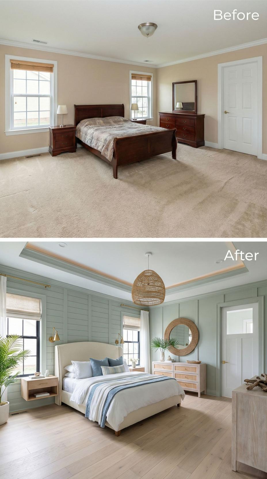 Sage green shiplap transforms basic beige walls into a sophisticated focal point in this remarkable bedroom makeover. The builder grade bedroomโs dark traditional furniture gives way to light wood coastal pieces, while a woven pendant light replaces the standard ceiling fixture. Natural textures and ocean-inspired colors create a serene retreat that feels worlds away from the original bland space.
