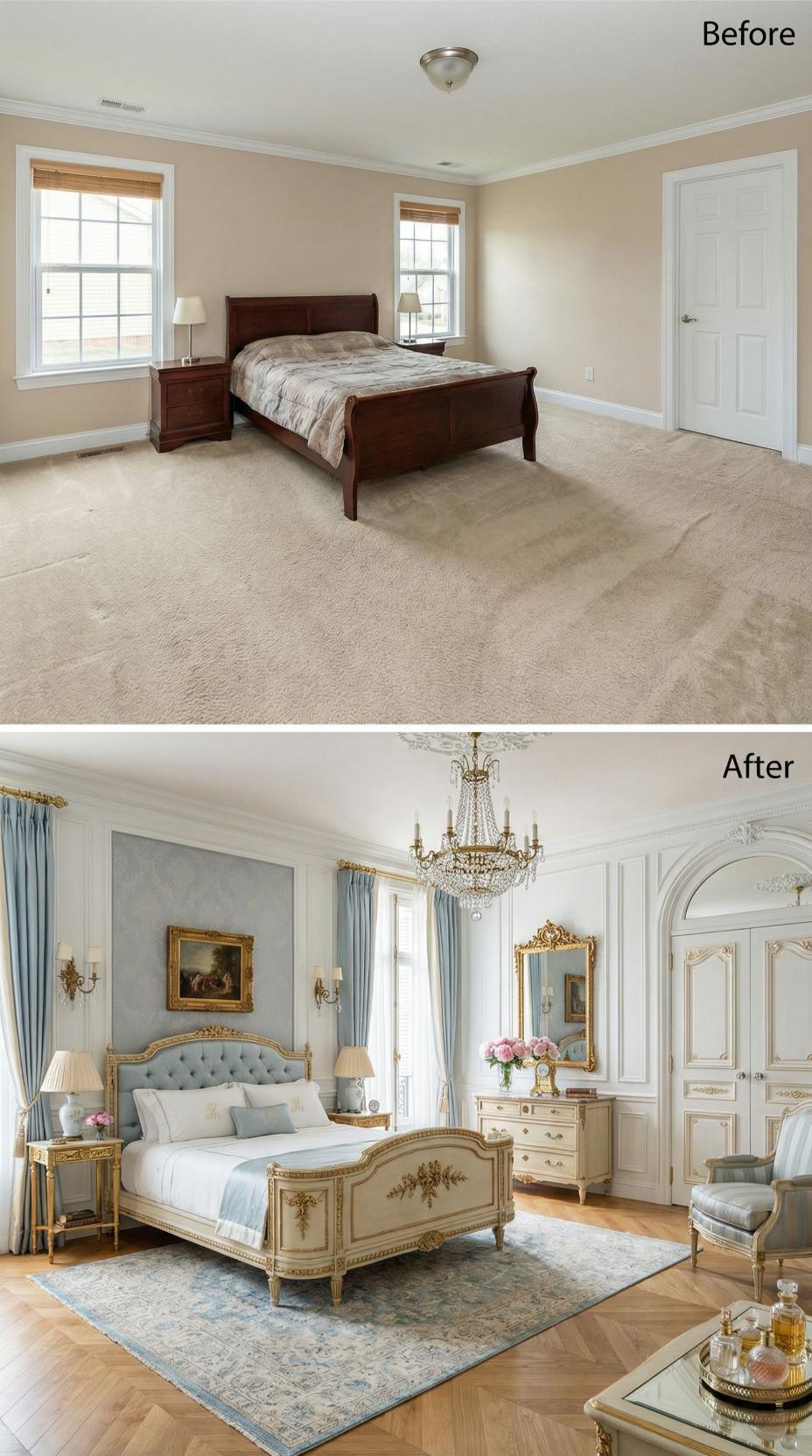 Opulent French provincial styling completely transforms this once-basic builder grade bedroom into a luxurious retreat. Crystal chandeliers replace simple flush-mount fixtures while ornate gold-leafed furniture elevates the space beyond recognition. Powder blue silk curtains, hand-painted wall panels, and an exquisite Persian rug create layers of sophisticated elegance that would make Marie Antoinette envious.