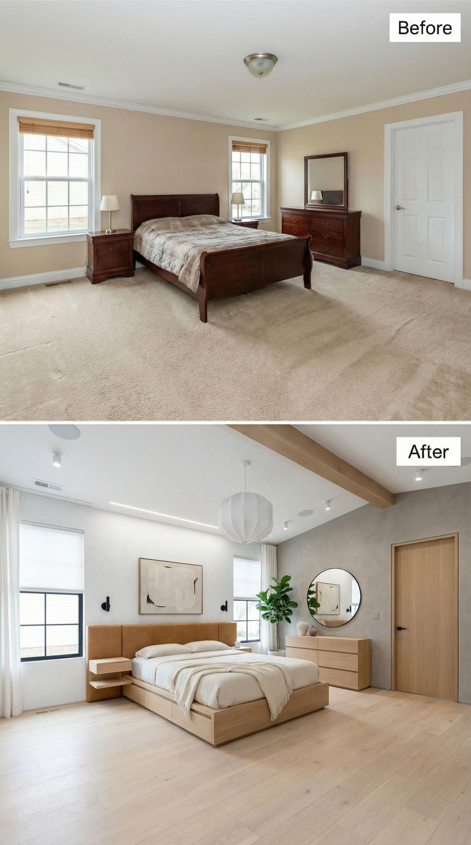Warm light wood furnishings replace the dark traditional pieces, creating an airy Scandinavian aesthetic. The platform bed with integrated nightstands maximizes functionality while minimizing visual clutter. Herringbone flooring adds sophisticated texture beneath the sleek furniture grouping. A statement pendant light and round mirror introduce contemporary elements that elevate the space from basic builder grade to thoughtfully curated retreat.