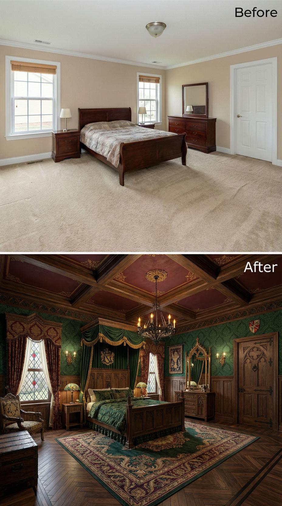 Ornate coffered ceilings with gilded moldings replace simple drywall, while emerald damask wallpaper and rich burgundy accents transform bland beige walls. Leaded glass windows, wrought iron chandeliers, and carved wooden furniture create an authentic medieval atmosphere. Intricate Persian rugs cover dark hardwood floors, completing this dramatic transformation from basic builder grade bedroom into a luxurious royal retreat.