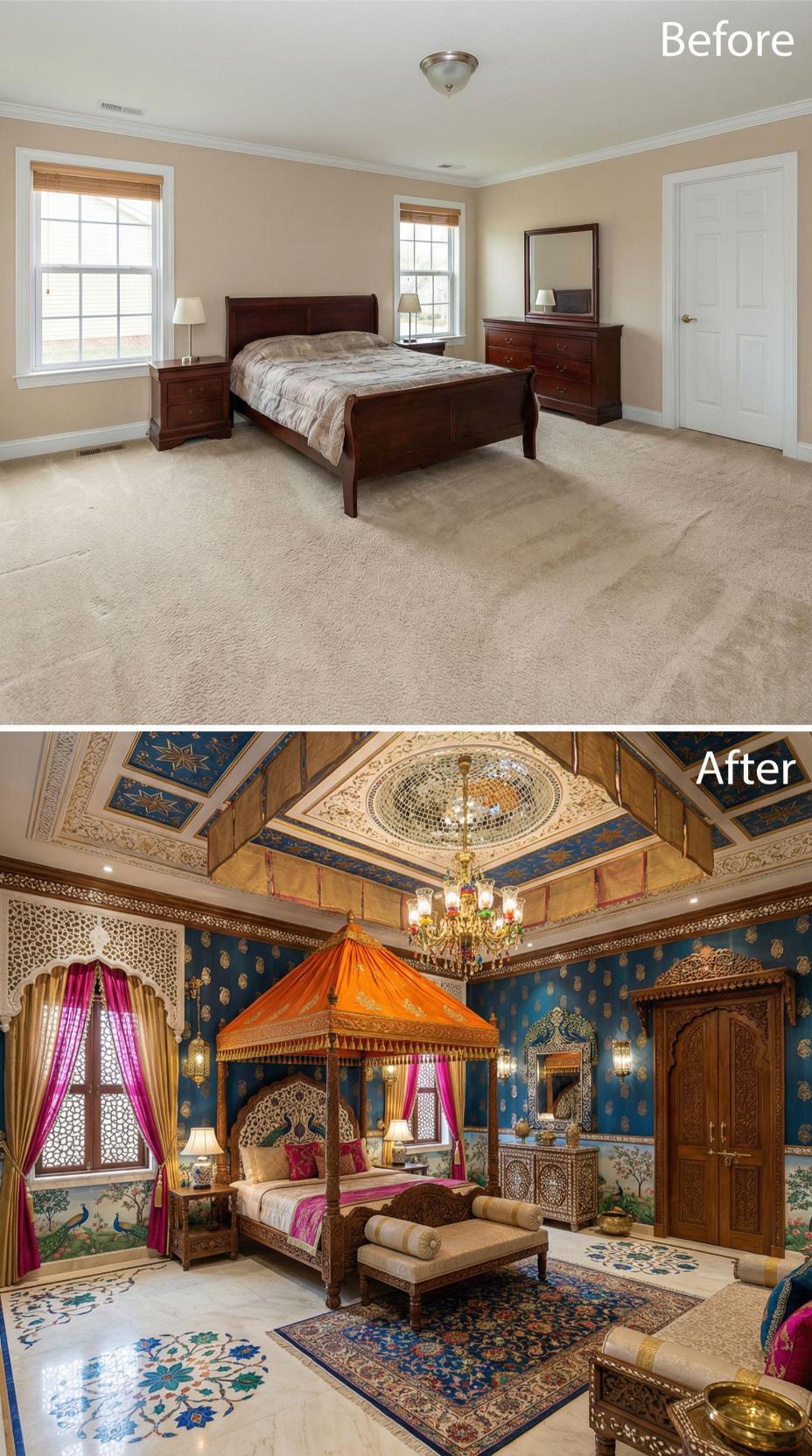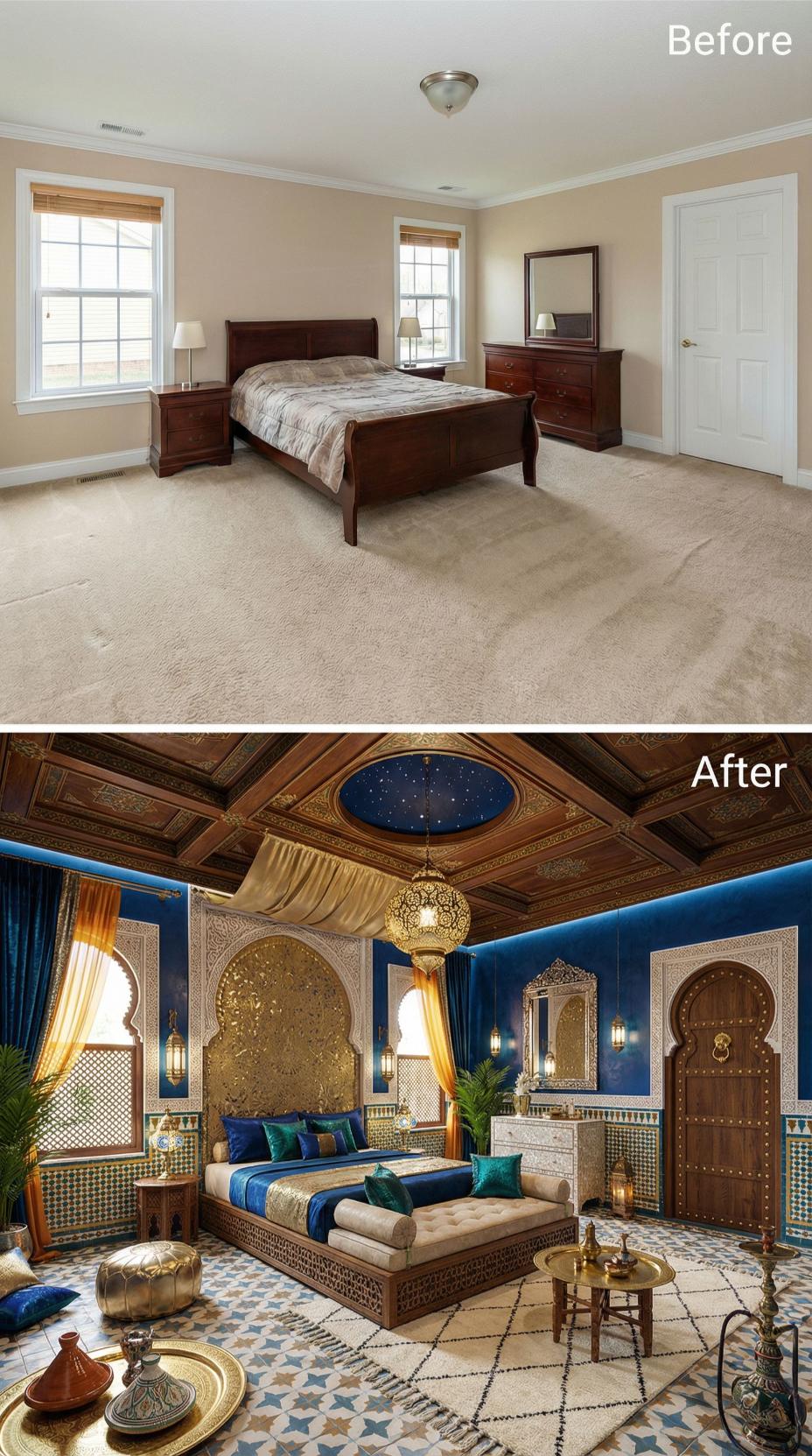 Bold transformation elevates a mundane builder grade bedroom into an exotic Moroccan retreat through rich cobalt blue walls, intricate geometric tilework, and ornate brass fixtures. Carved wooden screens, luxurious textiles in jewel tones, and an elaborate coffered ceiling with celestial details create an immersive cultural experience. Traditional lanterns and ornamental metalwork complete this stunning metamorphosis from basic to breathtaking.