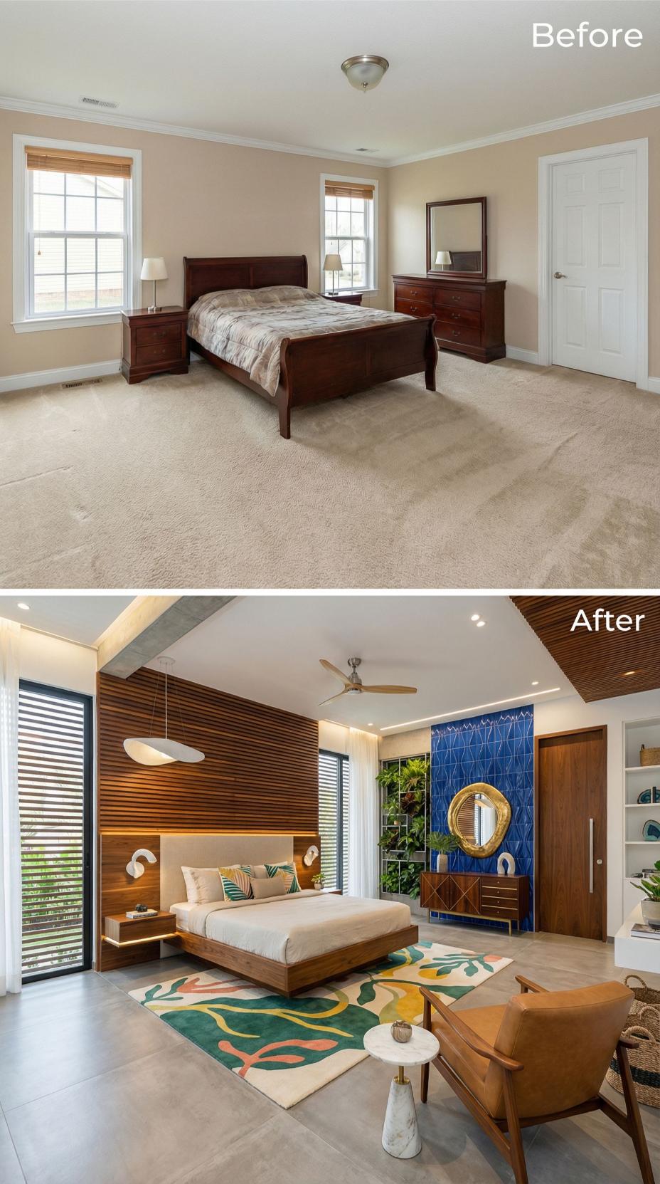 Warm walnut wood paneling transforms these bland beige walls into a sophisticated backdrop, while the floating platform bed anchors the contemporary design. Blue geometric tile creates a stunning accent wall behind the sculptural credenza, complementing the vibrant botanical area rug. Modern pendant lighting and built-in wardrobes elevate this space from basic builder grade to luxurious retreat.