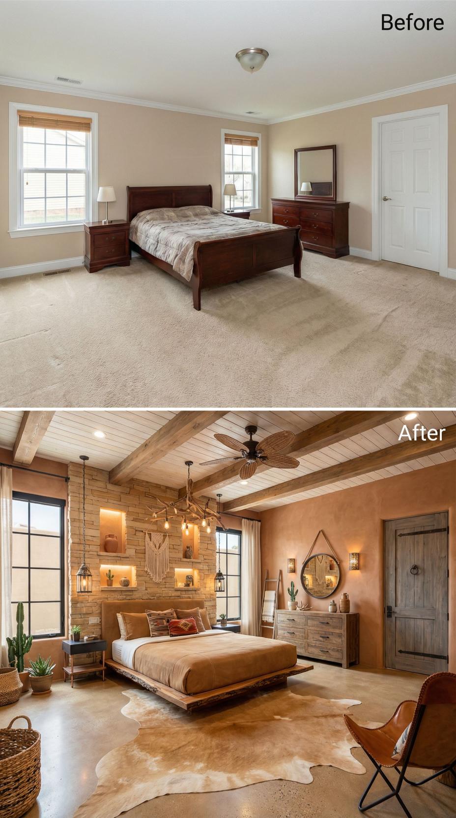 Exposed wooden ceiling beams and a striking stone accent wall completely transformed this builder grade bedroom into a warm southwestern retreat. The low-profile platform bed anchors the space while industrial pendant lighting and rich terracotta walls create dramatic contrast. Natural textures from cowhide rugs to woven baskets add authentic desert charm to this sophisticated makeover.