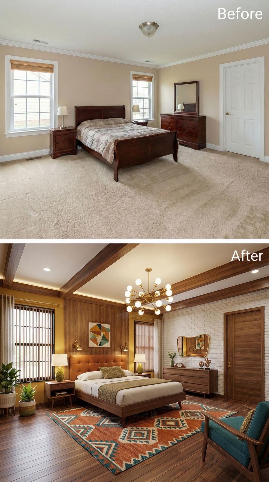 Dramatic exposed walnut ceiling beams and rich hardwood floors replace bland carpet and plain walls, instantly elevating this builder grade bedroom into a sophisticated retreat. The geometric area rug anchors mid-century furniture while brass accents and warm wood tones create an inviting atmosphere. Modern lighting and curated artwork complete the transformation from basic to breathtaking.