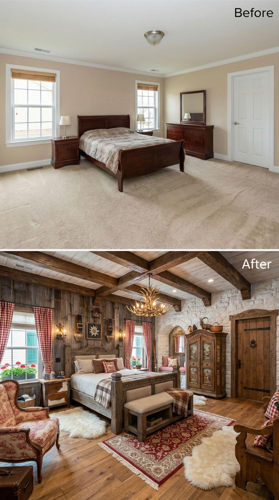 Exposed wooden beams and natural stone walls completely transformed this bland builder grade bedroom into a cozy mountain sanctuary. Rich reclaimed wood furniture, red gingham textiles, and warm copper lighting fixtures create an inviting rustic atmosphere. The original beige walls and basic carpet gave way to authentic materials and handcrafted details that evoke a luxury lodge experience.