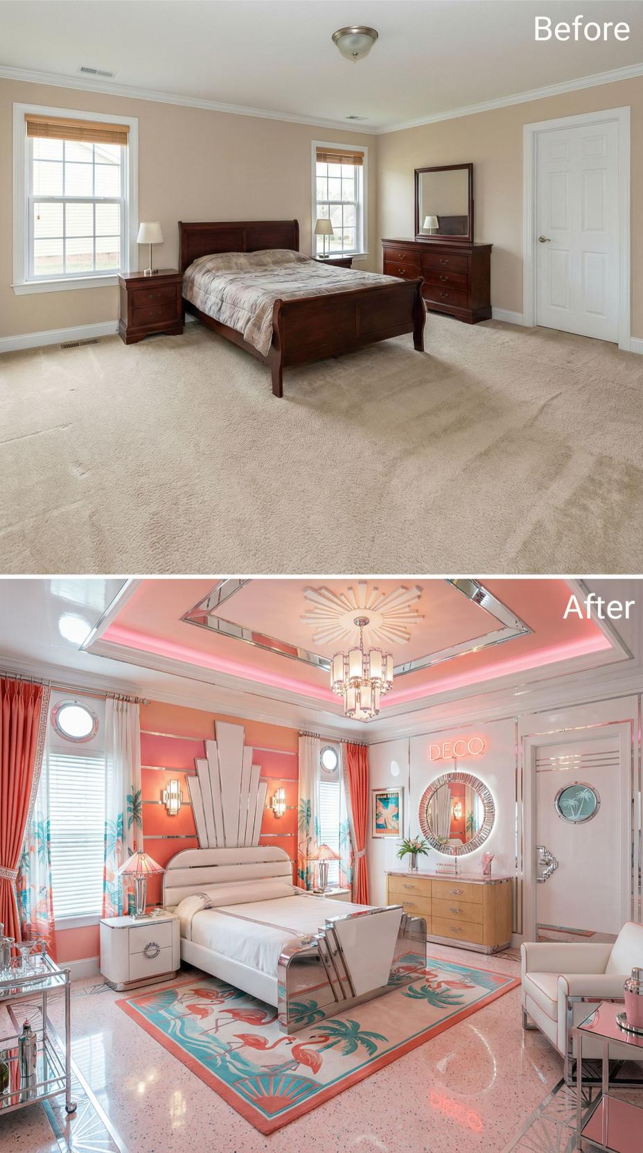 From Builder Grade Bedroom to Art Deco Miami Vice Paradise