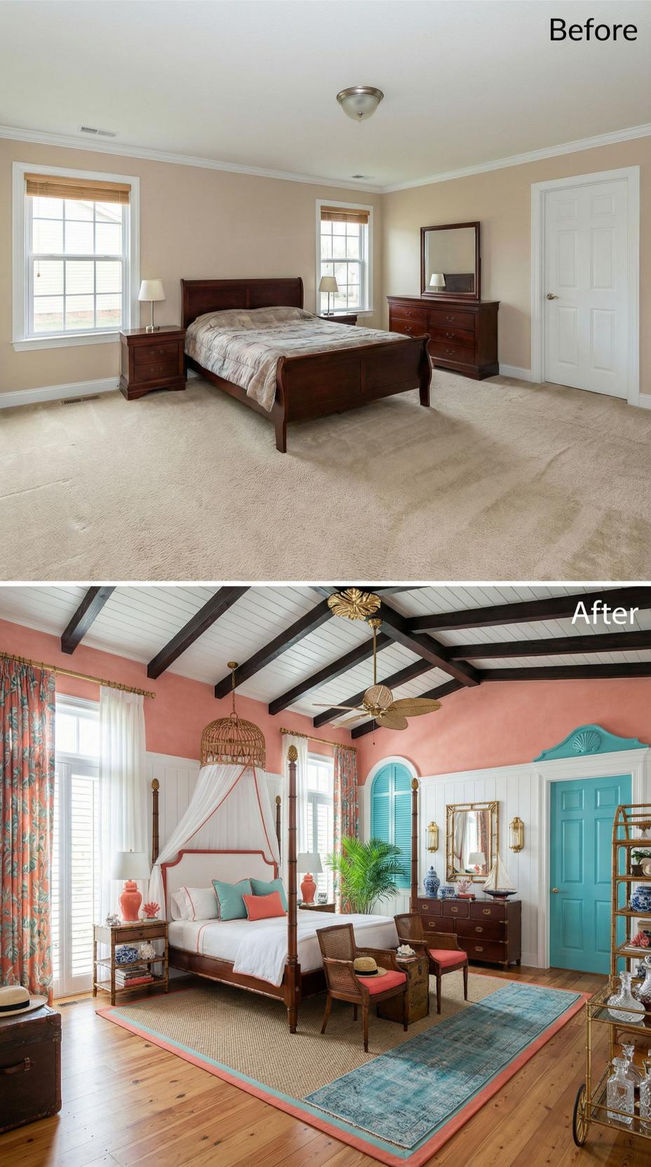 Bold coral walls and exposed dark wood beams completely transformed this bland builder grade bedroom into a vibrant tropical sanctuary. A four-poster canopy bed anchors the space while turquoise accents pop against natural textures. The addition of architectural ceiling details, layered rugs, and exotic plants creates an island-inspired escape that celebrates color and personality over generic neutrals.