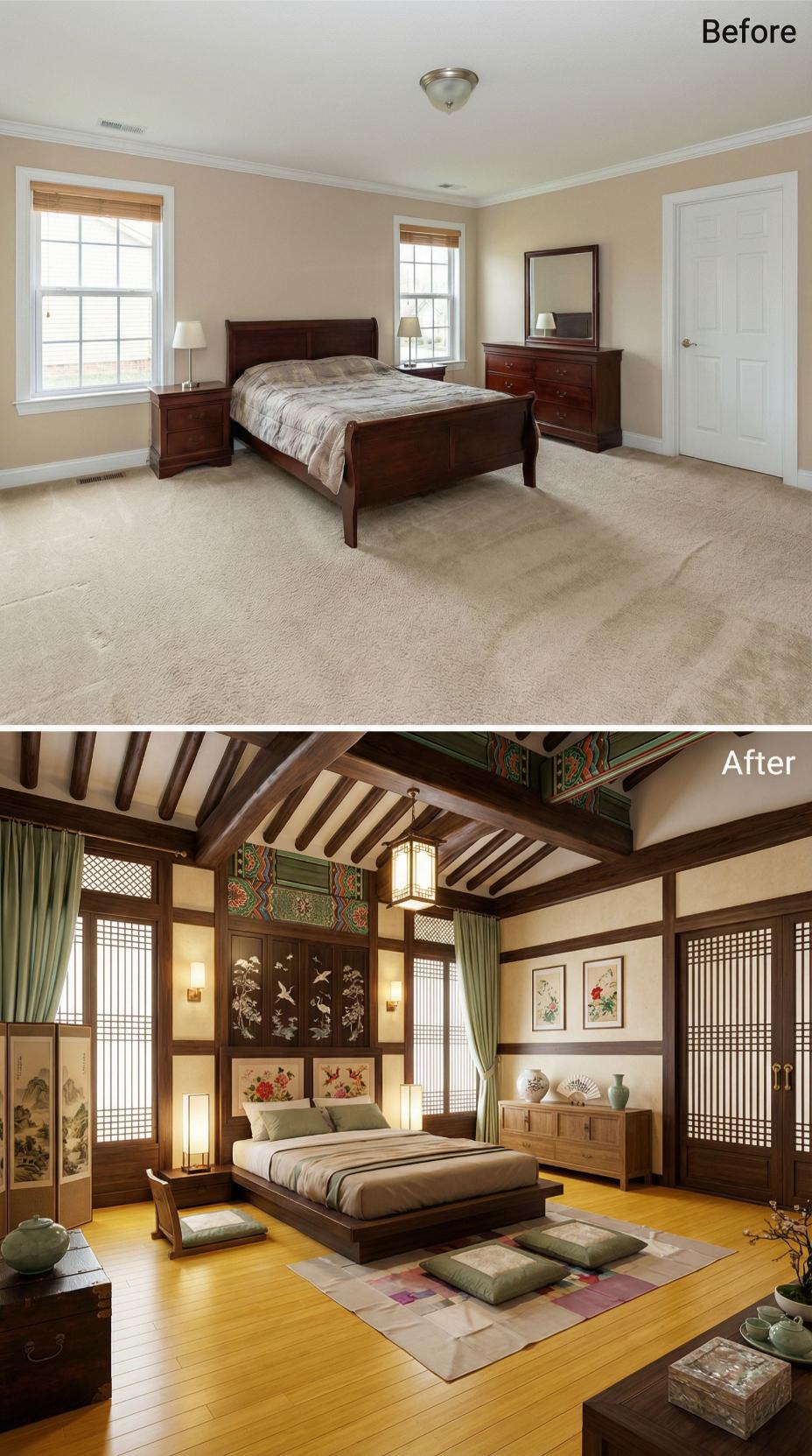 Traditional Korean dancheong painted ceiling beams frame this stunning transformation from bland builder grade bedroom to an authentic Asian-inspired retreat. Exposed dark wood structural elements, sliding shoji screen panels, and a low platform bed create architectural drama while maintaining serene simplicity. Floor cushions, botanical artwork, and warm wooden flooring complete this meditative sanctuary that celebrates traditional craftsmanship and mindful living.