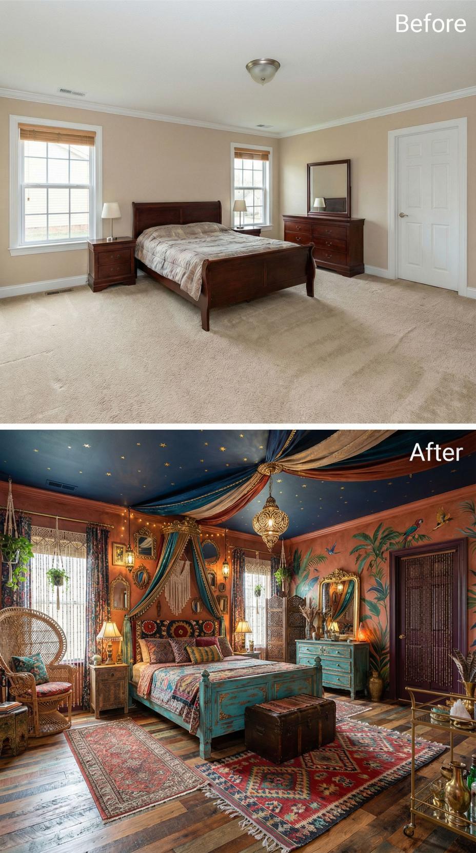 Bold transformation elevates this ordinary builder grade bedroom into an exotic retreat through dramatic design elements. Rich terracotta walls adorned with painted foliage create stunning contrast against the deep navy star-studded ceiling. Flowing fabric canopy draping, ornate Moroccan pendant lighting, and layered Persian rugs replace bland carpet and basic fixtures. Distressed turquoise furniture and brass accents complete the worldly sanctuary.