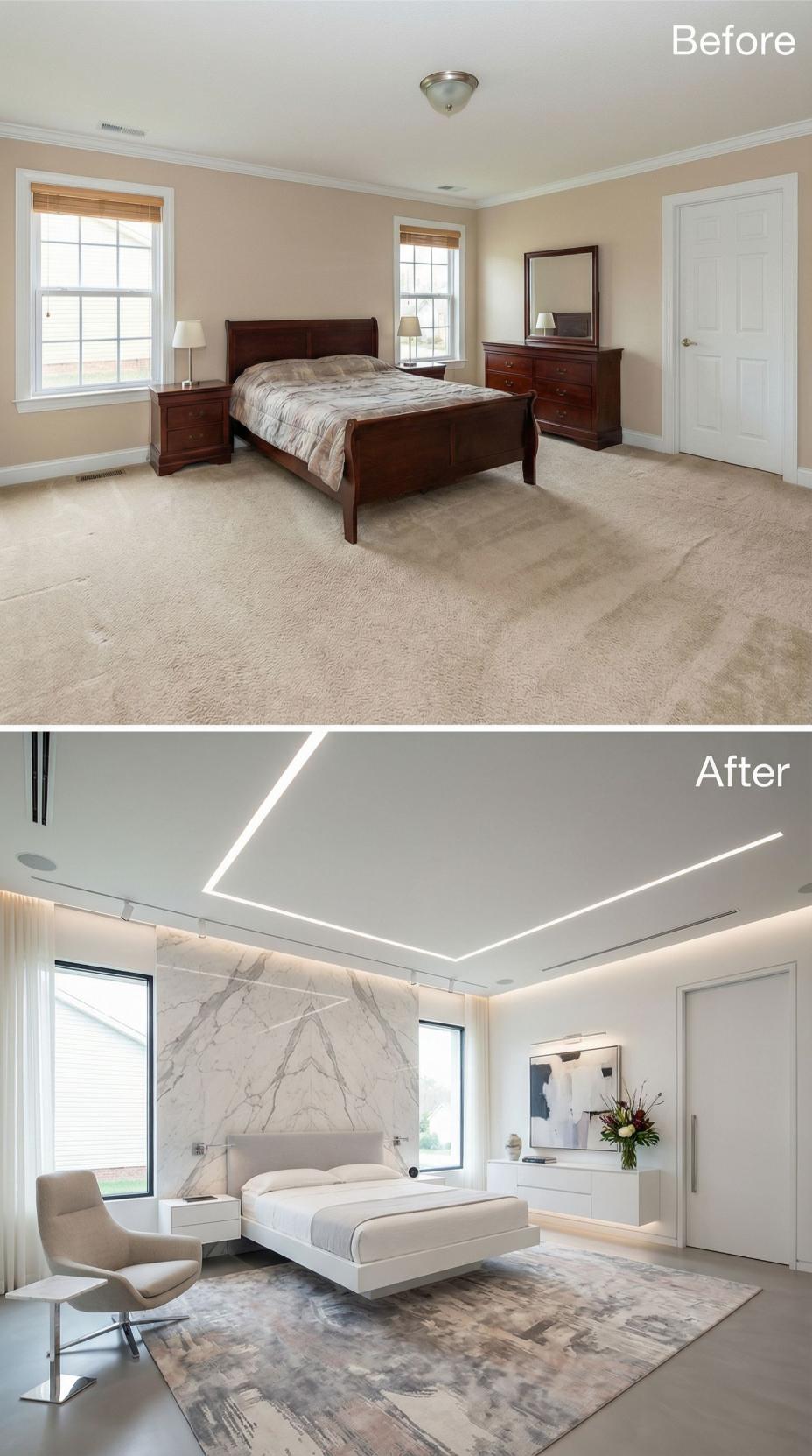 Dramatic architectural ceiling details with integrated LED lighting strips replace basic flat surfaces, while a stunning marble accent wall creates an instant focal point behind the floating platform bed. Modern white built-in storage and sleek contemporary furnishings completely transform the once-generic builder grade bedroom into a spa-like retreat that rivals five-star accommodations.