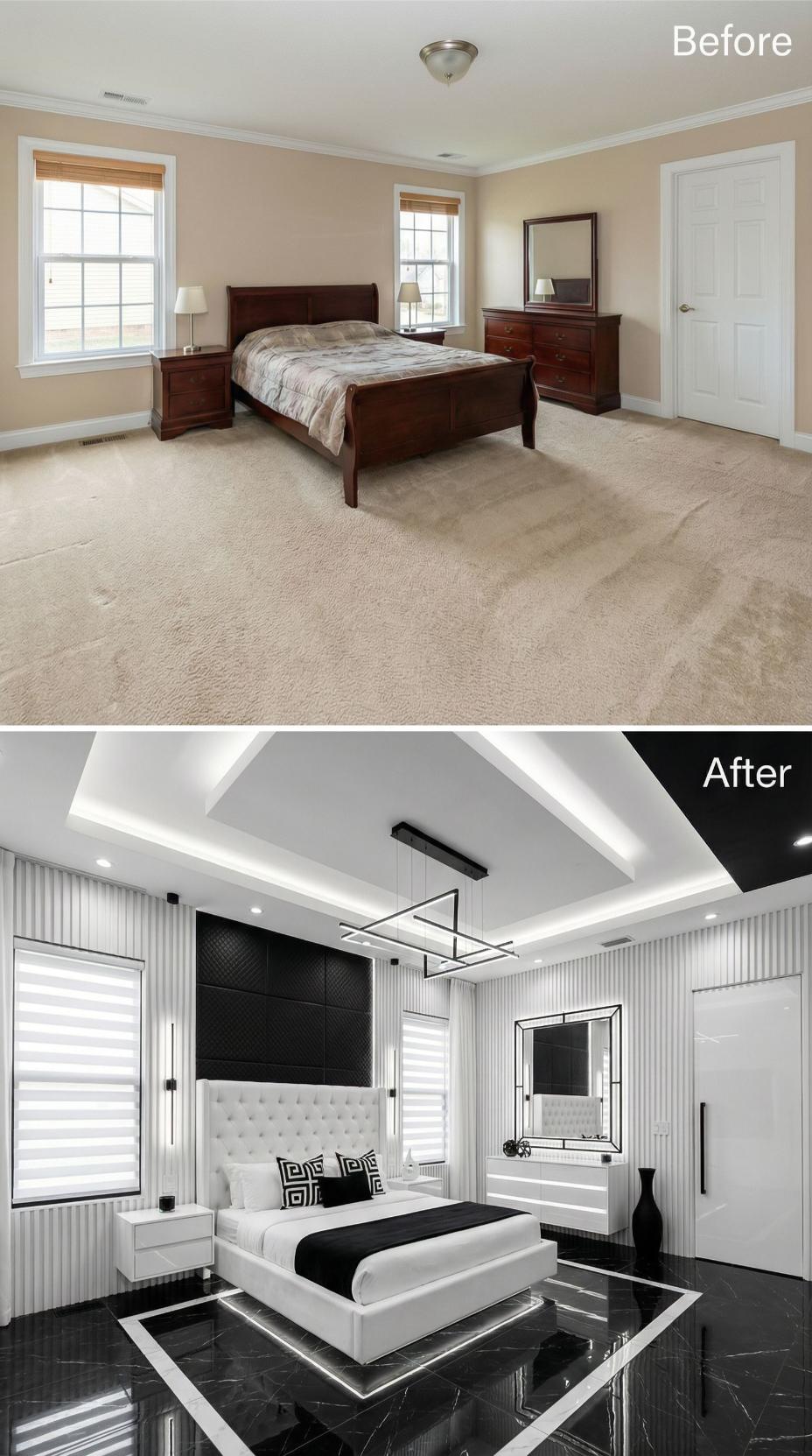 Dark marble flooring creates a dramatic foundation for this stunning transformation, replacing basic carpet with high-end sophistication. White platform bed with integrated nightstands anchors the space, while geometric black accent wall adds bold contrast. Coffered ceiling with LED strip lighting elevates the roomโs architectural interest, complementing modern zebra blinds and sleek white built-in wardrobes.