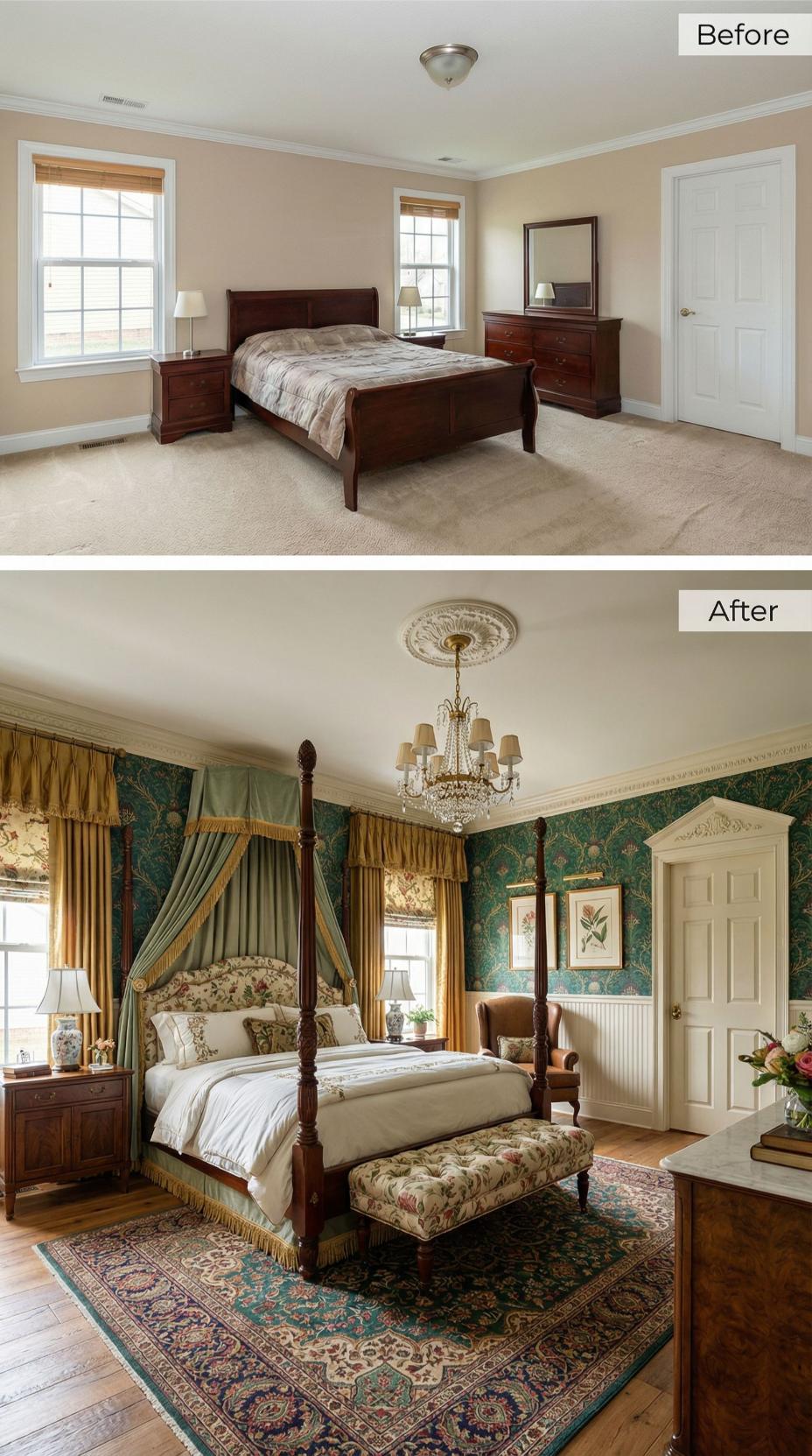 Traditional design elements completely transformed this plain builder grade bedroom into a sophisticated English country retreat. Rich emerald botanical wallpaper creates dramatic contrast against crisp white wainscoting, while luxurious window treatments frame the space with gold-trimmed valances and flowing curtains. The mahogany four-poster bed anchors the room with classic elegance, complemented by an ornate crystal chandelier and authentic Persian area rug.