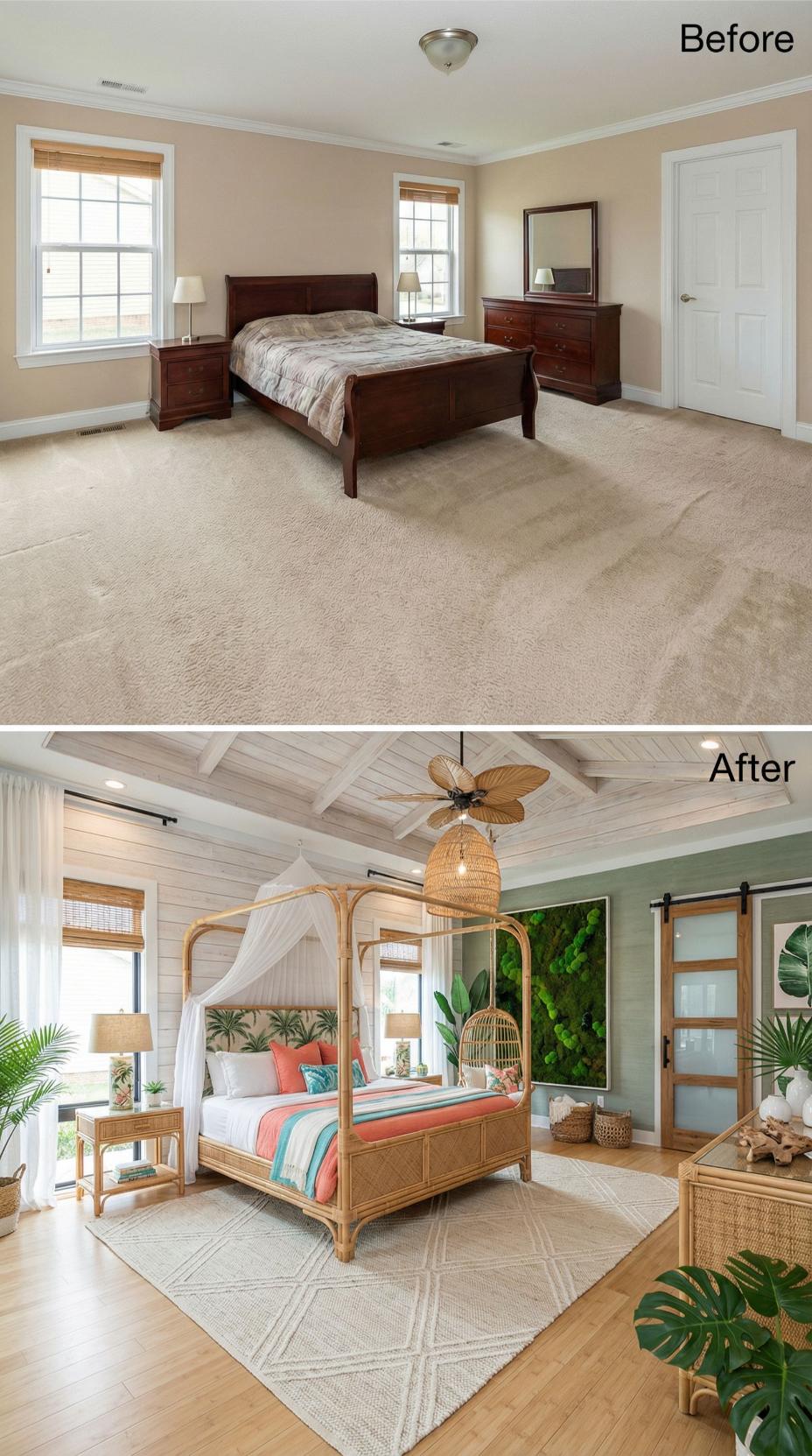 Dramatic architectural upgrades transformed this bland builder grade bedroom into a stunning tropical retreat. White shiplap ceiling treatment with exposed beams replaces flat drywall, while hardwood floors eliminate dated carpet. The rattan canopy bed anchors the space, complemented by a living moss wall, woven pendant lighting, and vibrant coral accents that create an instant vacation vibe.