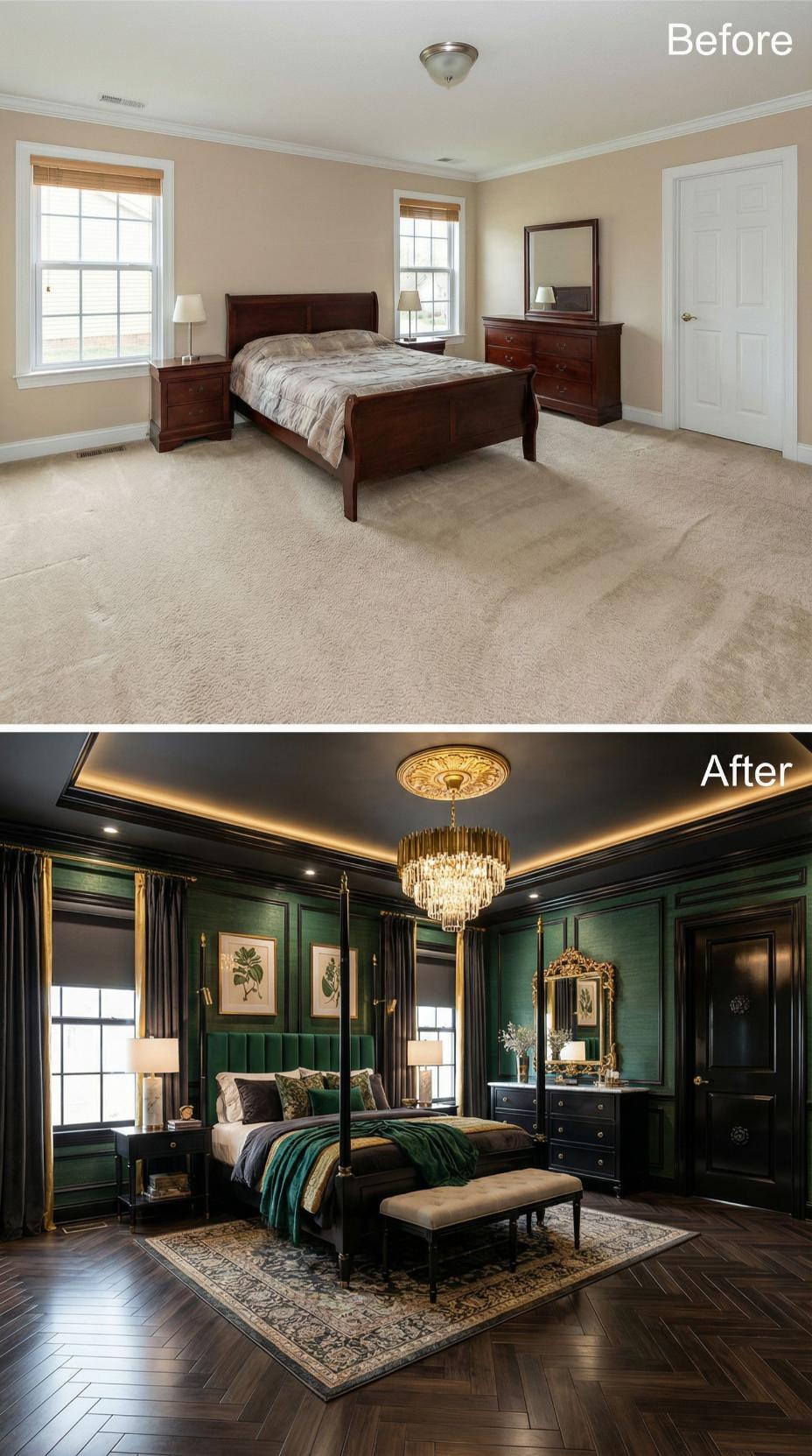 From Builder Grade Bedroom to Moody Emerald Sanctuary