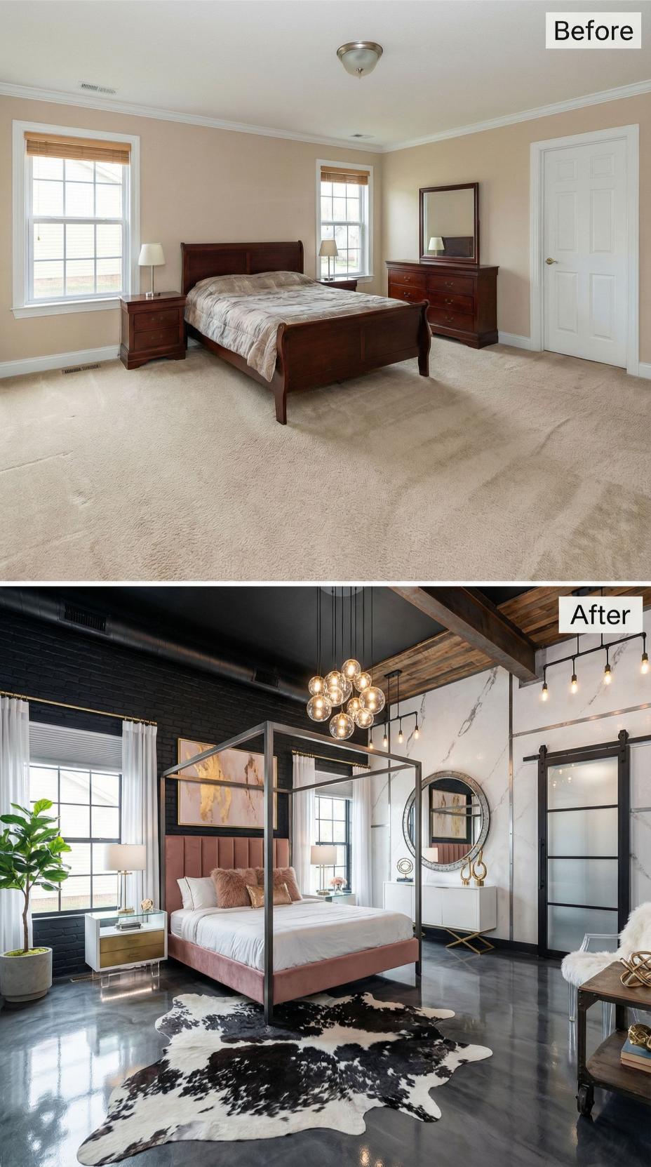 Bold transformations elevate this builder grade bedroom into a sophisticated retreat through dramatic black accent walls and luxurious metallic finishes. The canopy bed anchors the space while polished concrete floors replace basic carpet, creating stunning reflective surfaces. Glamorous lighting and statement mirrors add sparkle, while cowhide rugs introduce organic texture that perfectly balances the sleek industrial elements.