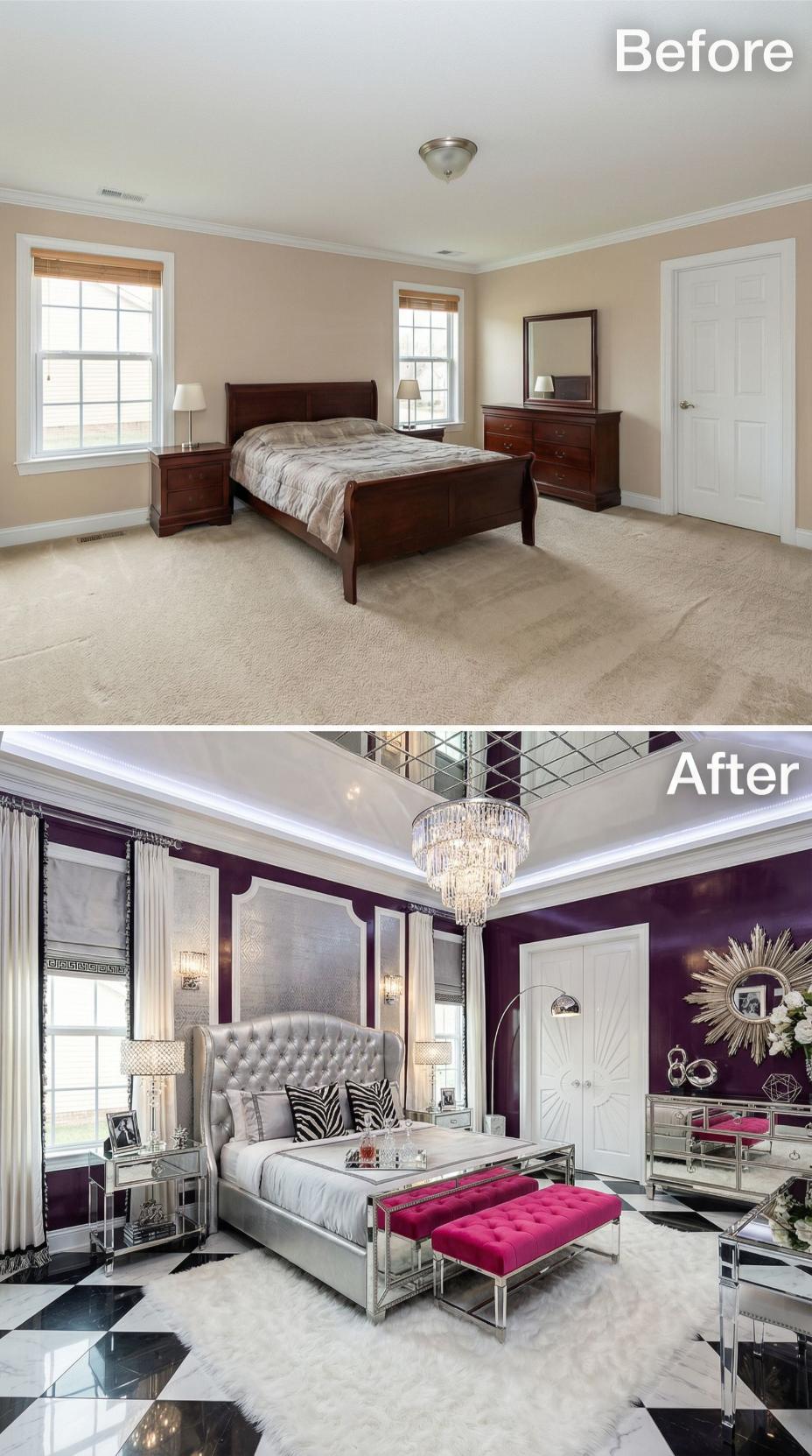 Dramatic plum walls replace bland beige paint, creating an opulent backdrop for this stunning transformation. The builder grade bedroomโs basic furniture gives way to a luxurious tufted silver headboard, mirrored nightstands, and crystal chandelier. Metallic accents, rich textures, and bold magenta bench seating elevate the space into a sophisticated retreat worthy of old Hollywood glamour.