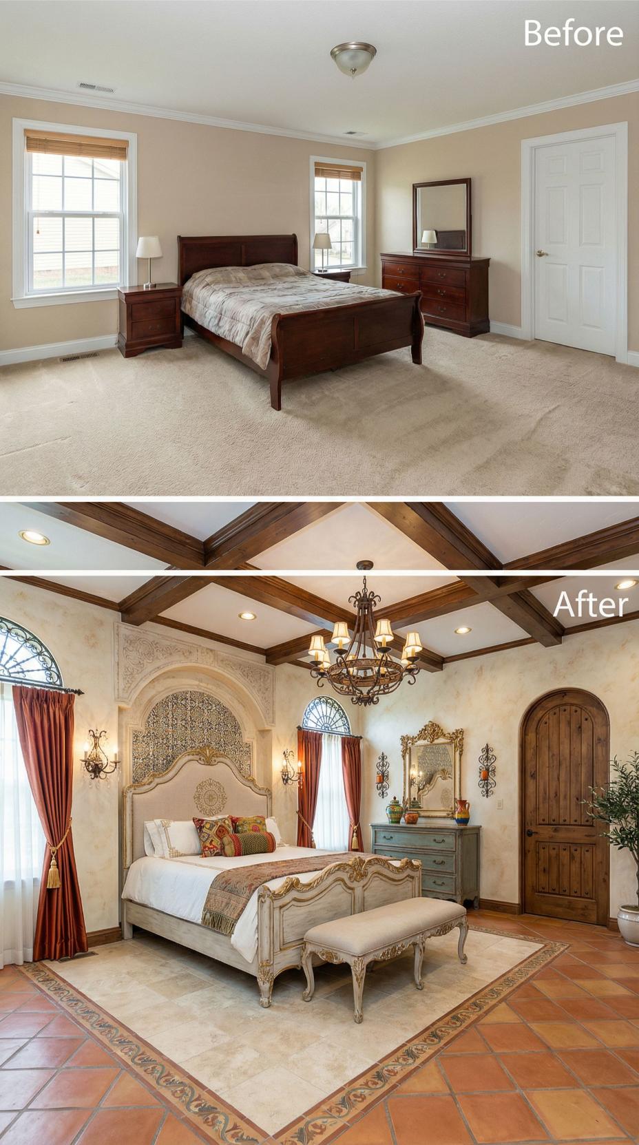 Dramatic exposed wood ceiling beams and ornate ironwork transform this plain builder grade bedroom into a stunning Mediterranean retreat. Rich terracotta tile flooring replaces basic carpet, while an elaborate crystal chandelier and decorative wall sconces create ambient lighting. The custom arched doorway, ornate French-style bed frame, and luxurious textiles complete this remarkable transformation from standard to spectacular.