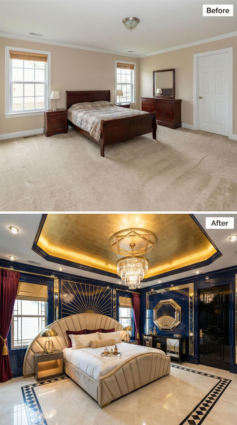 Bold navy blue lacquered walls with gold geometric molding completely reimagine what was once a bland builder grade bedroom. The transformation features a dramatic coffered ceiling with warm gold lighting, luxurious crystal chandelier, and ornate wall panels that create stunning visual depth. Rich burgundy velvet curtains and an upholstered cream bed with dramatic curved headboard elevate the space into a sophisticated art deco sanctuary.