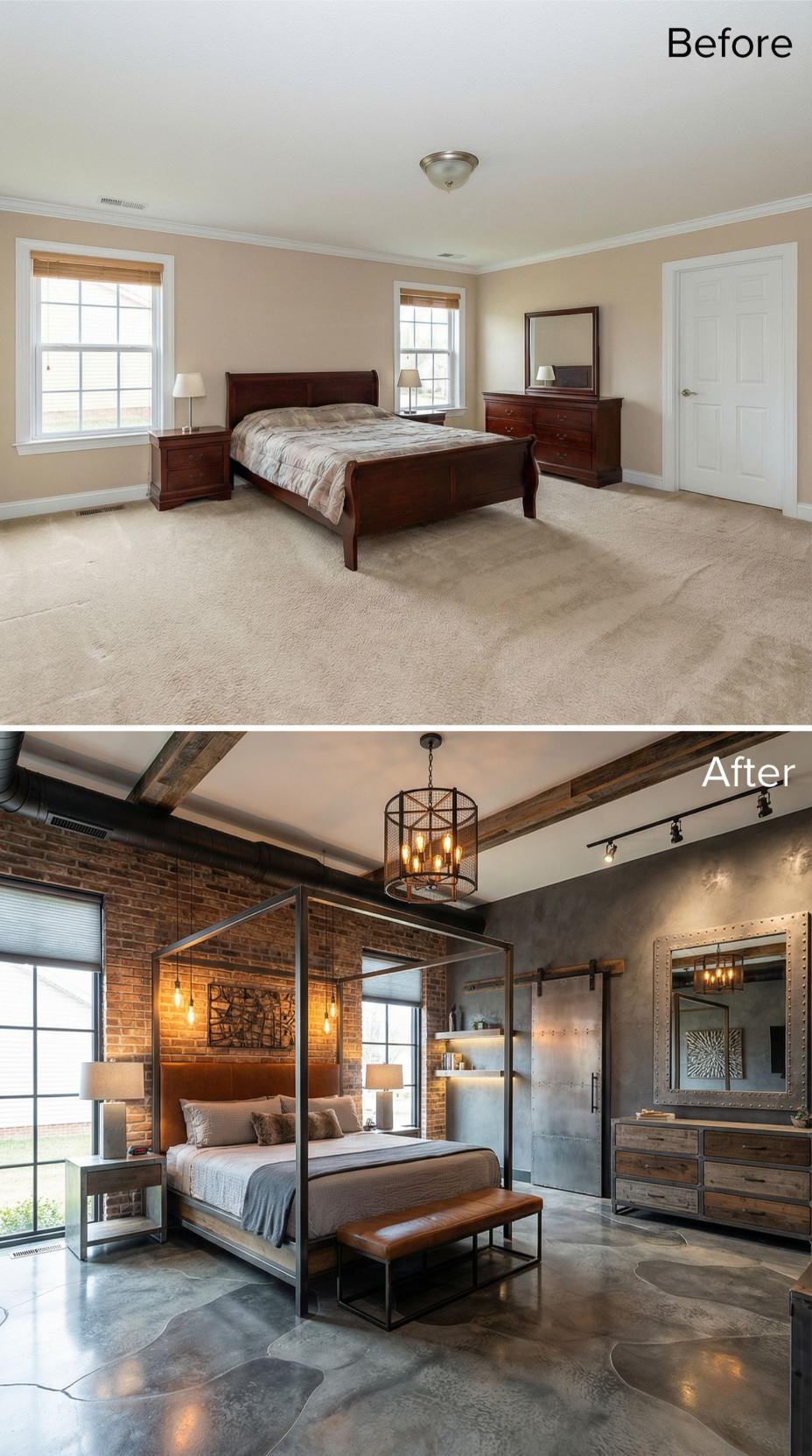 Raw exposed brick walls and weathered wood beams transform this builder grade bedroom into an urban industrial sanctuary. A sleek metal canopy bed anchors the space while polished concrete floors with geometric inlays replace generic carpet. Dramatic pendant lighting and sliding barn doors elevate the design from standard to sophisticated loft living.