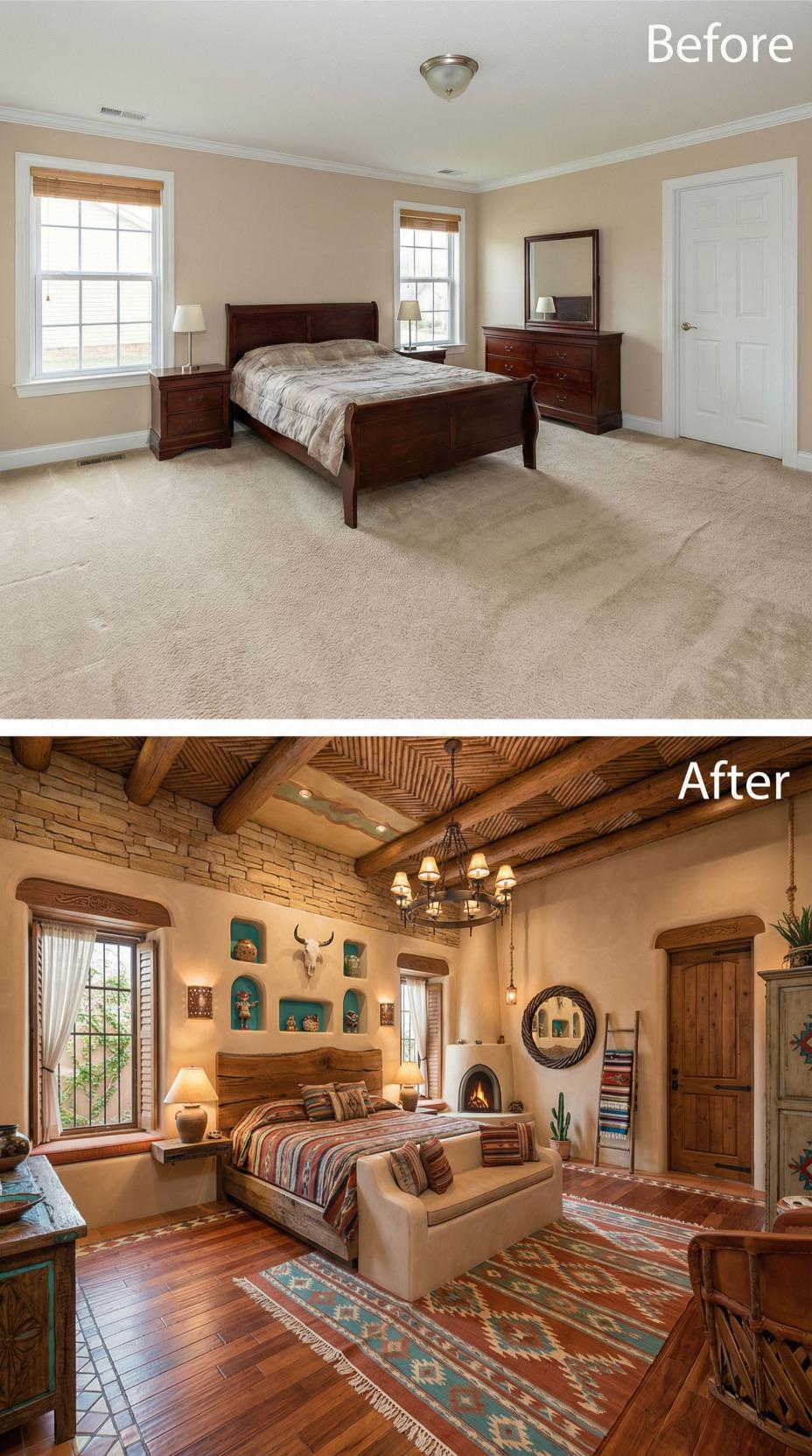Exposed wood beam ceilings and a corner kiva fireplace transform this builder grade bedroom into an authentic southwestern sanctuary. Rich hardwood floors replace bland carpeting, while handcrafted furniture and turquoise pottery create striking focal points against warm adobe-toned walls. Natural wood shutters, wrought iron accents, and Native American textiles complete the dramatic desert-inspired makeover.