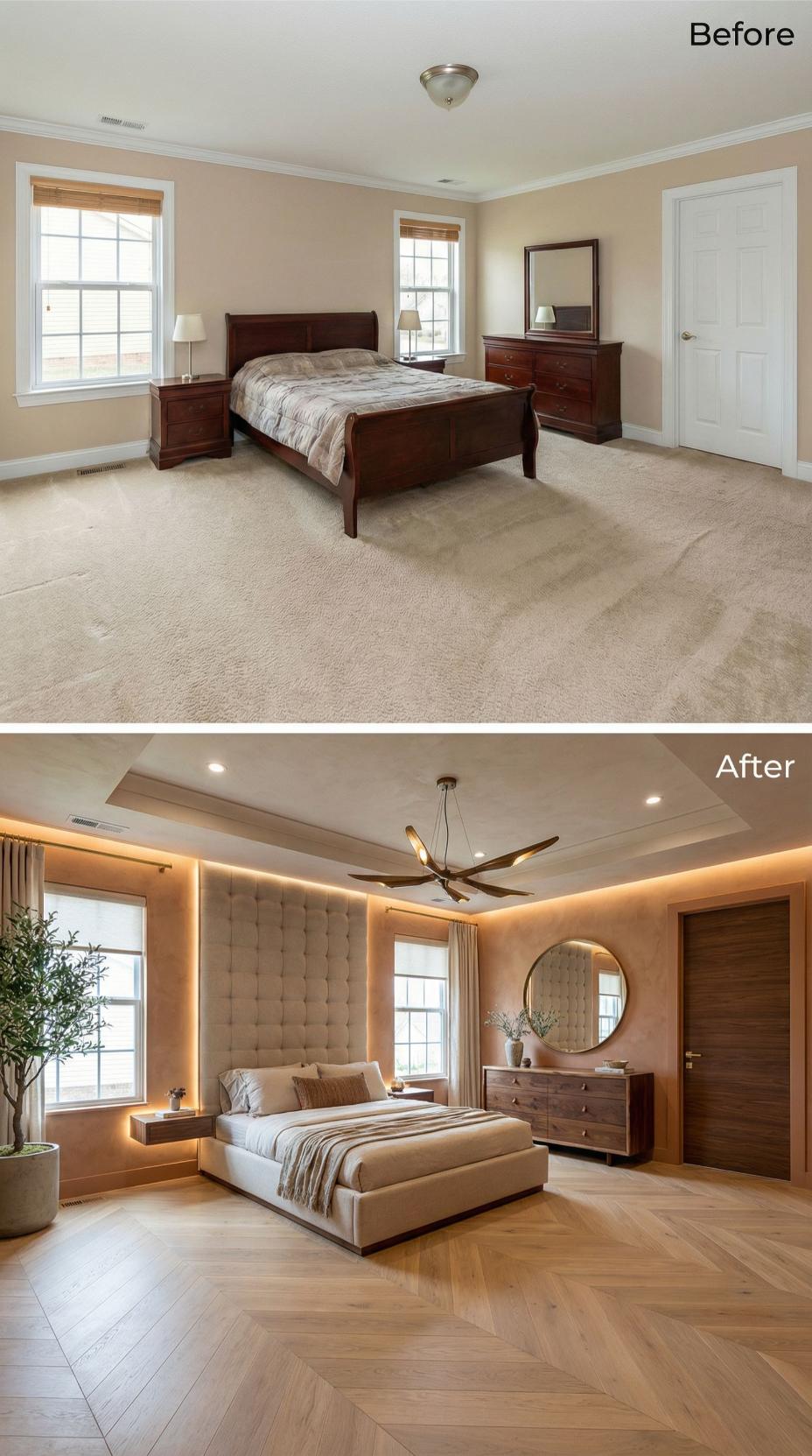 Warm wood flooring replaced generic beige carpet while LED strip lighting transformed plain walls into a stunning tufted headboard feature. The builder grade bedroom gained sophisticated depth through layered lighting, including recessed ceiling fixtures and a modern ceiling fan. Rich wood tones, neutral linens, and strategic accent lighting create an upscale hotel-like atmosphere that elevates the entire space.