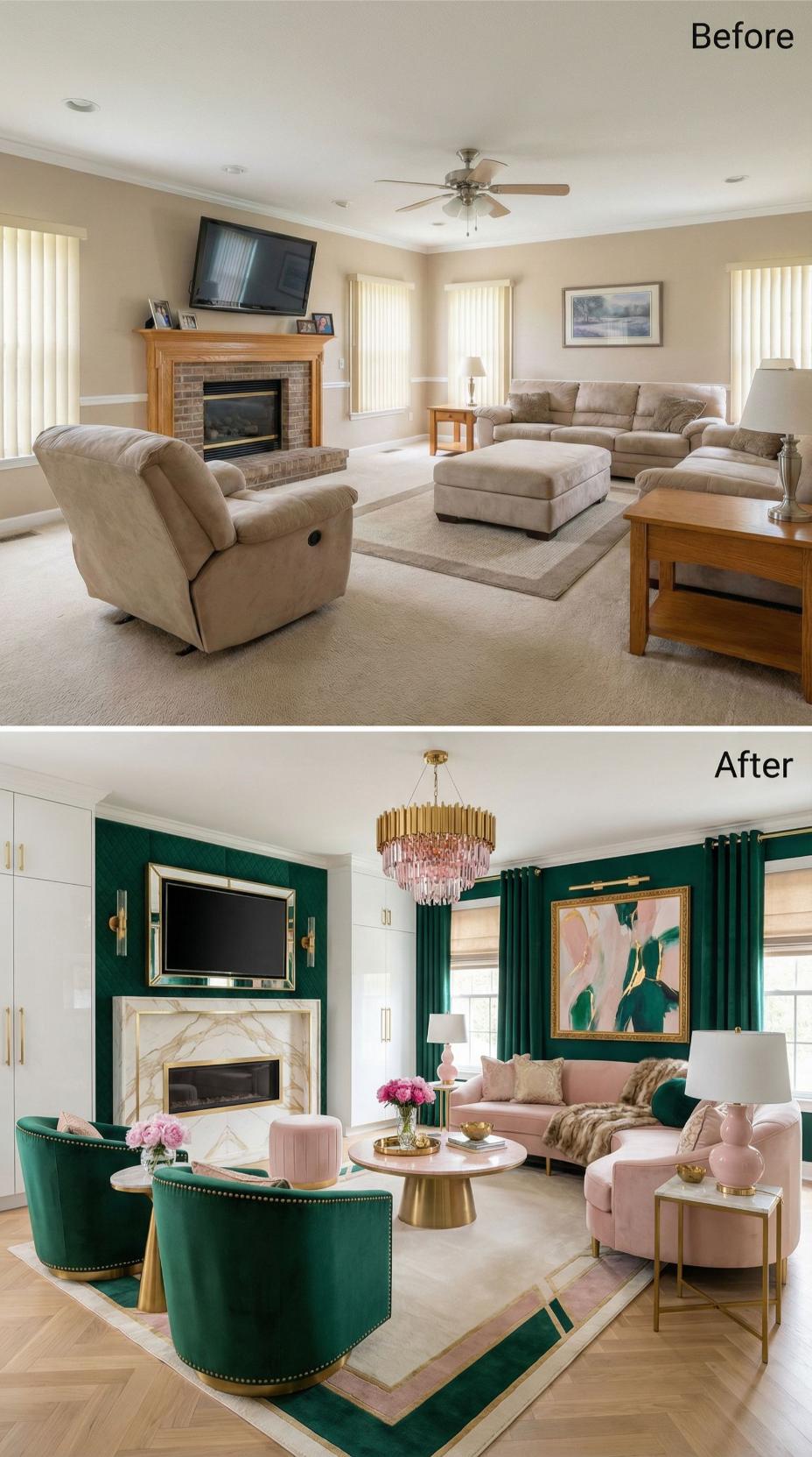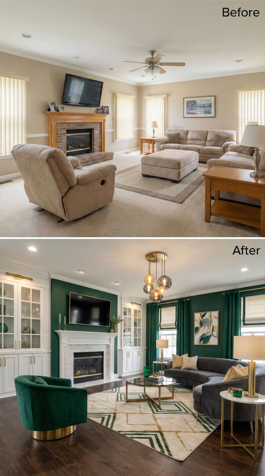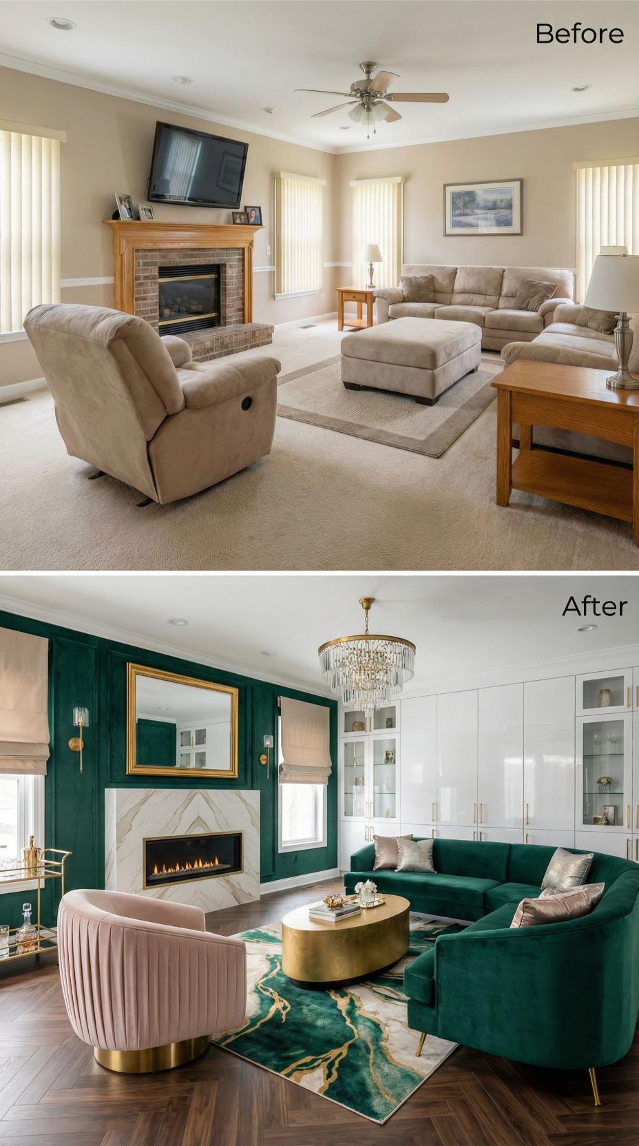 Bold emerald green walls and luxurious velvet sectional seating completely reimagine this once-beige builder grade family room. Marble chevron fireplace surround replaces basic brick, while a crystal chandelier elevates the space from ordinary ceiling fan territory. Gold brass accents throughout the room create sophisticated contrast against the rich jewel tones, proving dramatic color choices deliver maximum visual impact.