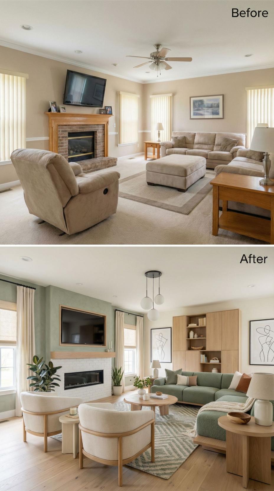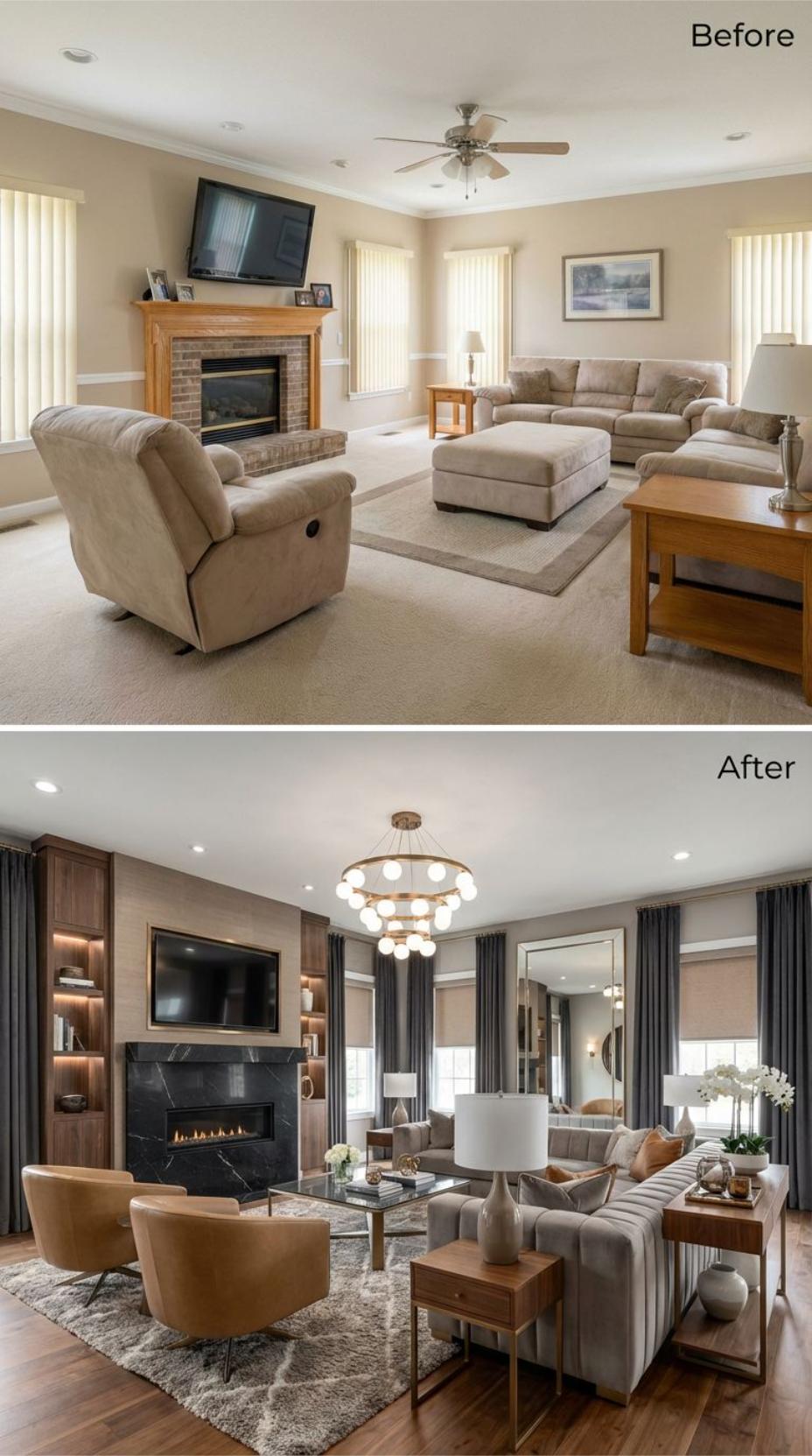 Marble transforms the ordinary brick fireplace into a stunning focal point, while custom built-ins replace generic furniture arrangements. Designer lighting elevates the ceiling treatment, and a sophisticated neutral palette banishes the beige builder grade aesthetic. Curved seating creates intimate conversation areas, complemented by statement mirrors and lush greenery that bring life to this dramatically reimagined space.