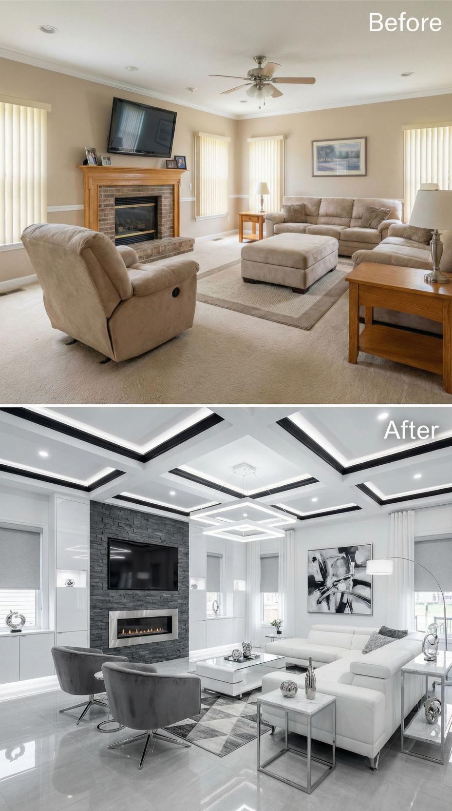 Dramatic architectural ceiling details replace the basic flat surface, while sleek charcoal stone transforms the ordinary brick fireplace into a stunning focal point. White leather sectionals and chrome accents elevate the neutral builder grade furnishings, creating a sophisticated monochromatic palette. Strategic lighting and geometric patterns add luxury layers that turn this once-generic space into a show-stopping entertainment room.