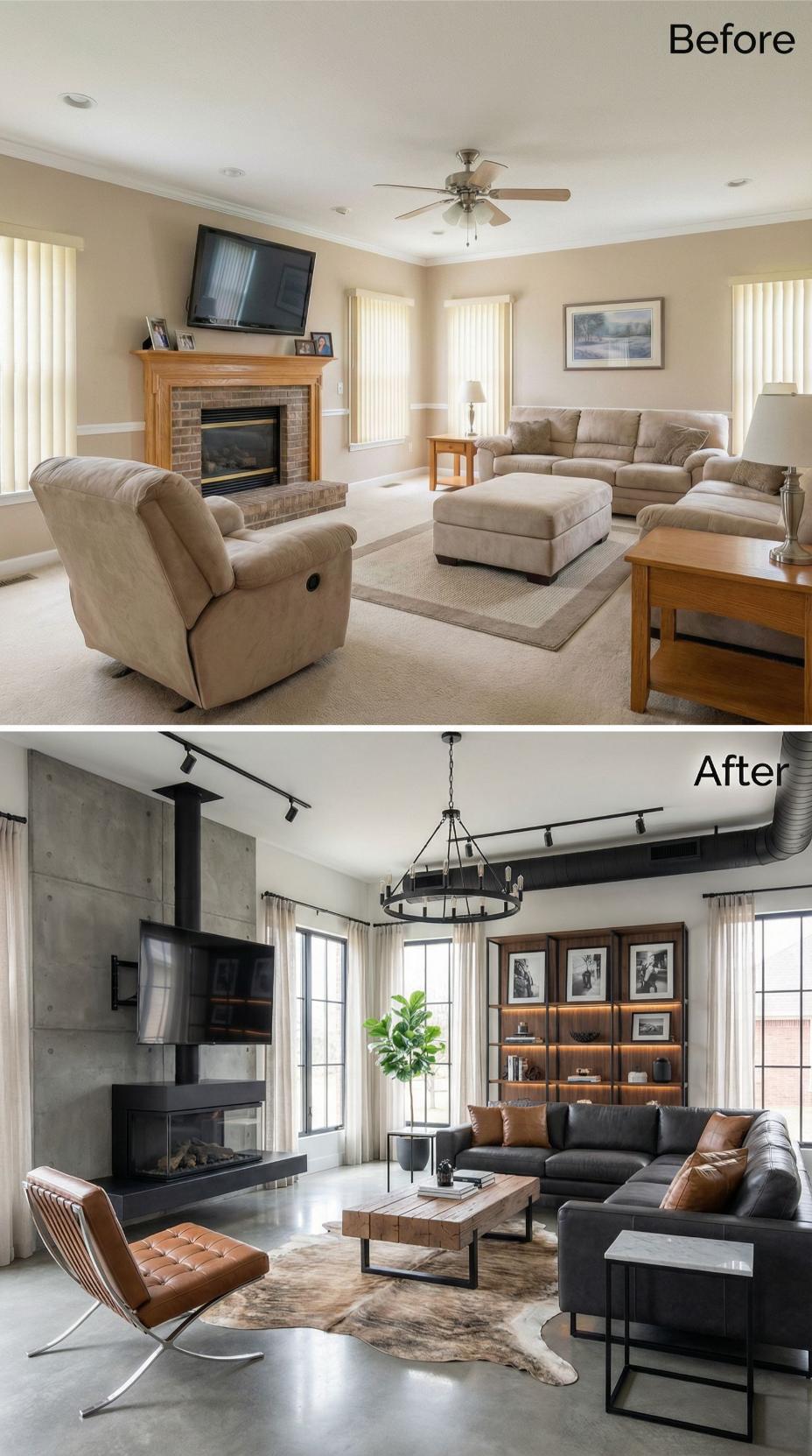 Concrete walls and black steel replace generic beige finishes in this dramatic transformation. The builder grade family room shed its vanilla vertical blinds for sleek black-framed windows and contemporary drapery. A striking black fireplace surround anchors the space, while rich leather seating and warm wood built-ins create sophisticated contrast against the industrial backdrop.