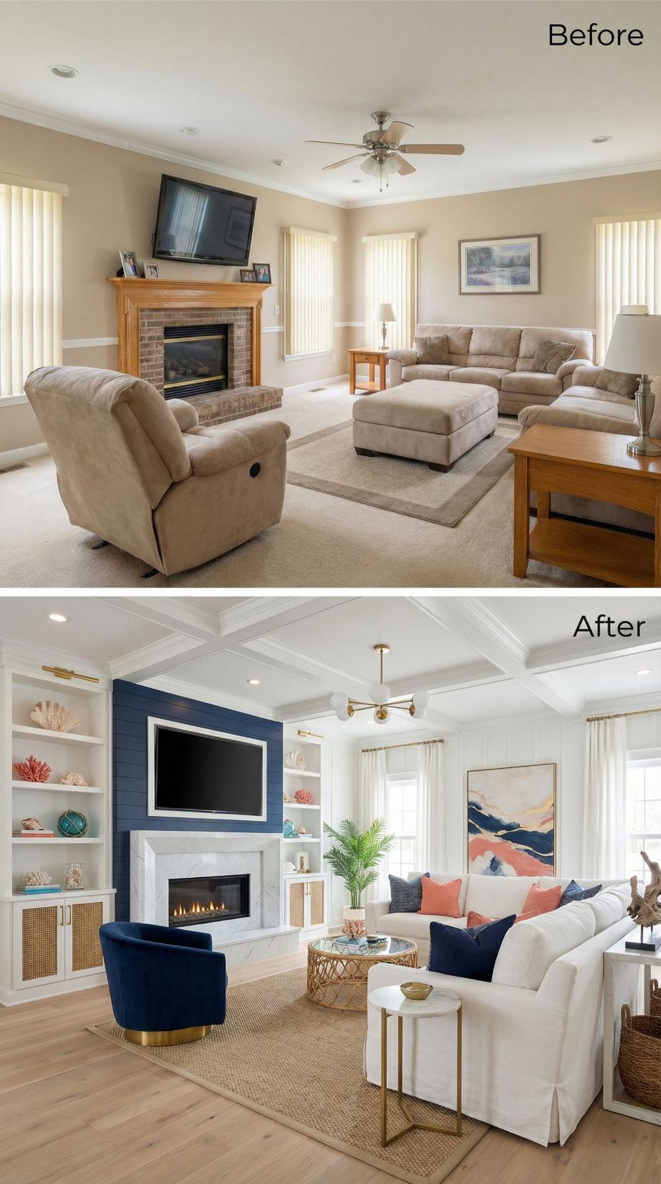 Rich navy shiplap transforms the fireplace into a stunning focal point, while custom built-ins replace generic walls with sophisticated storage and display space. Coffered ceilings add architectural drama overhead, and the neutral sectional gains personality through coral and navy pillows. Brass lighting fixtures and natural textures elevate this space from cookie-cutter bland to magazine-worthy magnificence.