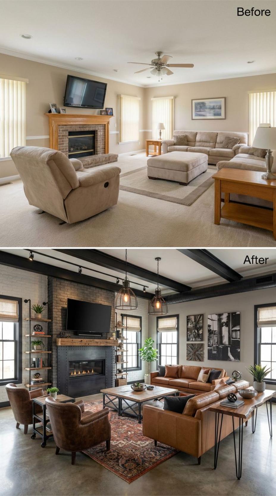Dark exposed ceiling beams and pendant lighting transform this formerly generic builder grade family room into a dramatic showcase. Rich leather seating replaces beige upholstery while a striking black fireplace surround updates the basic brick. Industrial-style shelving, vintage Persian rugs, and curated artwork create layers of personality that elevate the space from forgettable to magazine-worthy.
