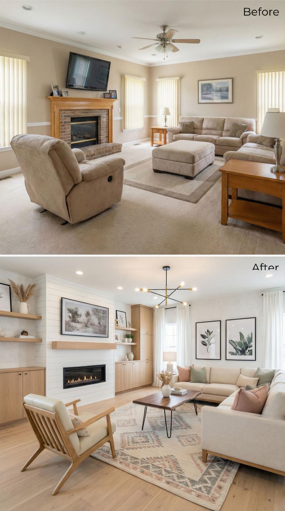 Warm wood tones and clean white shiplap transformed this generic builder grade family room into a sophisticated retreat. Custom built-ins replace outdated furniture arrangements, while a sleek linear fireplace updates the traditional brick surround. Natural light floods through streamlined window treatments, highlighting the curated botanical artwork and luxurious sectional seating that creates an Instagram-worthy entertaining space.