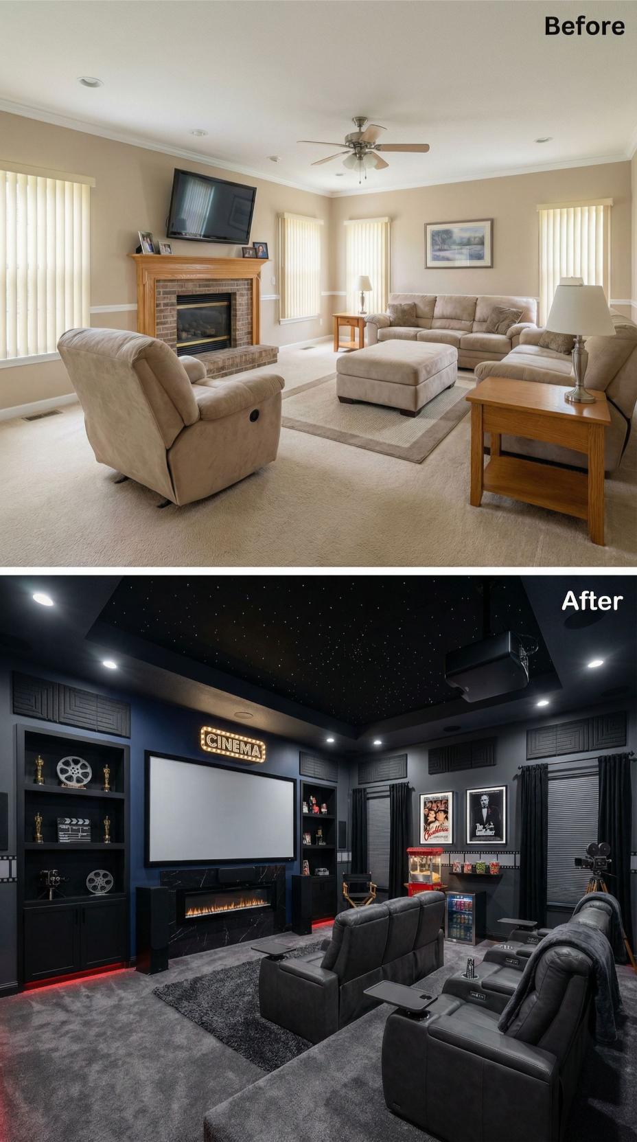 Dark charcoal walls and a starry ceiling transform this builder grade family room into a luxurious home theater designed for maximum visual impact. Custom built-ins showcase movie memorabilia while theater seating replaces generic furniture. Dramatic LED accent lighting creates an immersive atmosphere that commands attention and admiration from every guest.