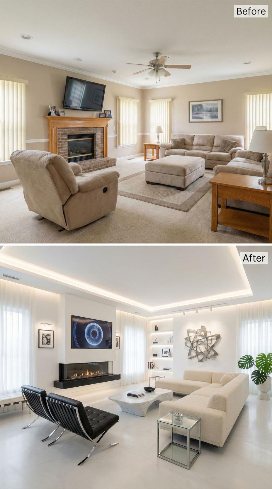 Dramatic LED cove lighting transforms this once-ordinary builder grade family room into a sleek showcase worthy of architectural magazines. The traditional brick fireplace gives way to a stunning linear gas unit, while built-in shelving creates gallery-worthy display space. Luxurious white sectional seating and black Barcelona-style chairs replace dated beige furniture, complemented by glass accent tables and bold geometric wall art that commands attention.